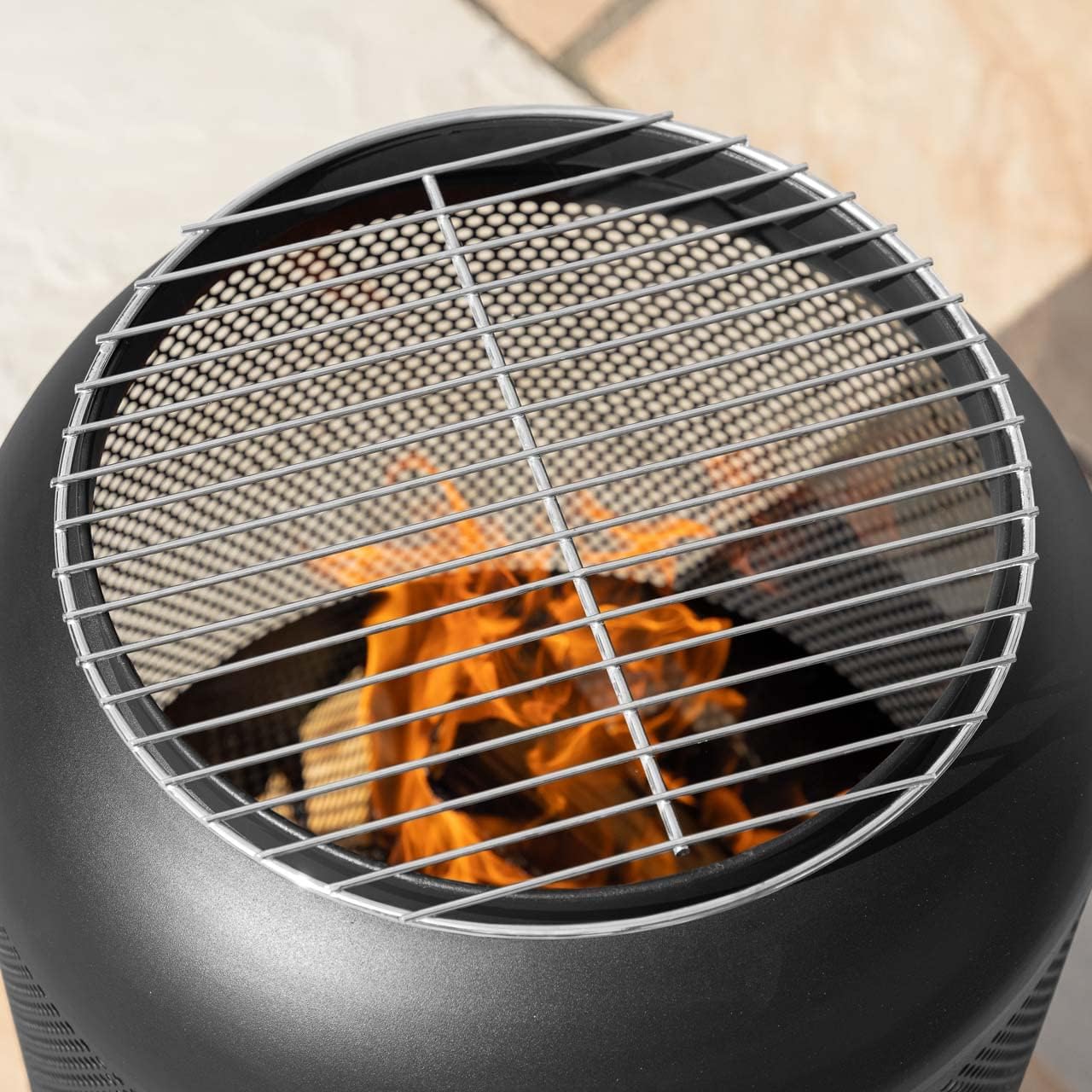 - Feuerschale aus Gitter – Diese hochwertige Feuerstelle verfügt über ein Design aus Gitter, um einen stilvollen und modernen Look in Ihrem Garten zu schaffen und die Luftzirkulation zu verbessern. Mit einem Schürhaken und Feuerrost geliefert.