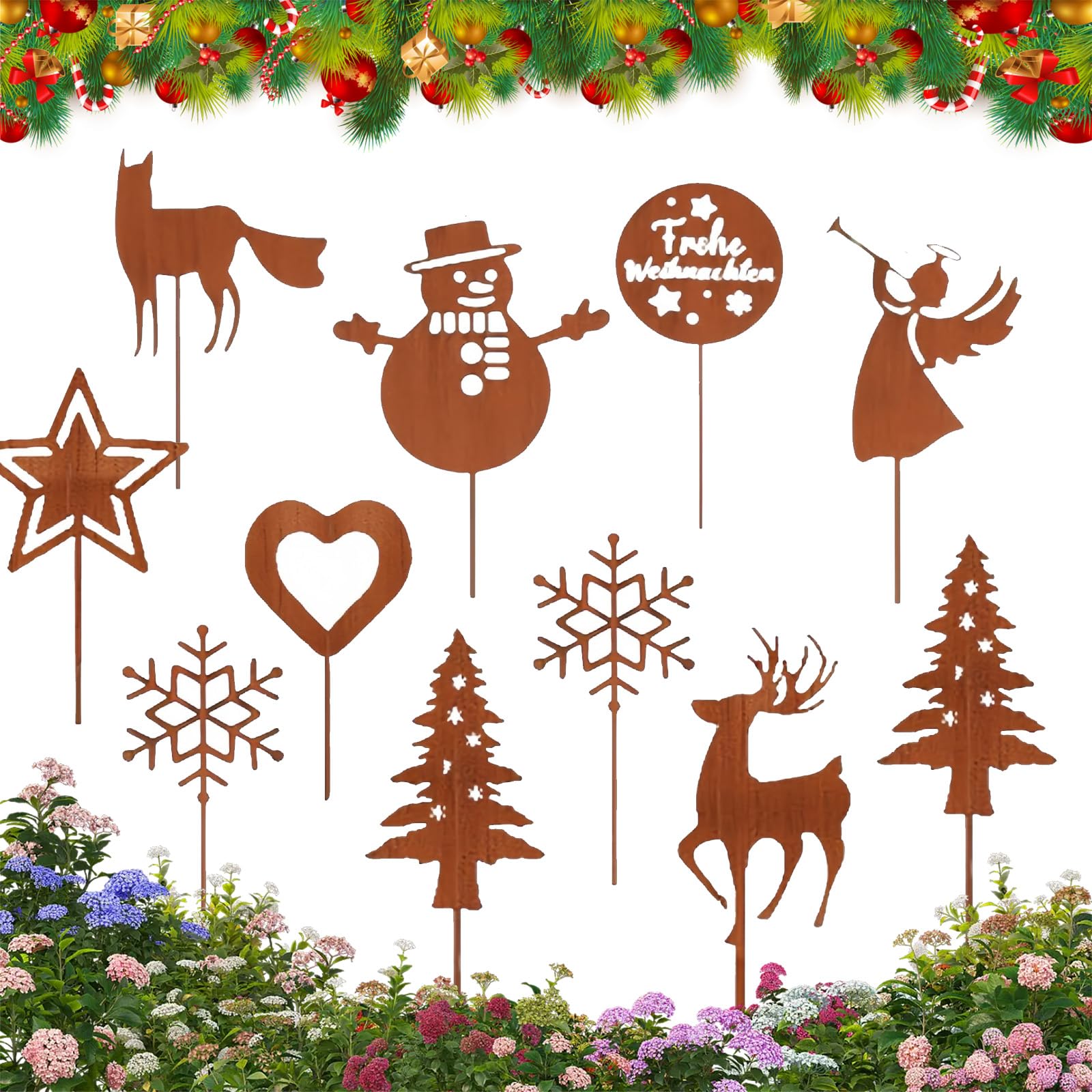 - Garten Metallstecker Zum Advent: Dieses Set enthält insgesamt 11er Set Garten Roststecker mit Waldelementen und ist erlesene Muster speziell für den Advent; Die Muster umfasst Rentiere, Schneemann, Stern, Schneeflocken, Weihnachtskugel,