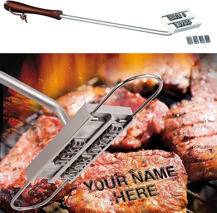 - Grill-Brandeisen mit Holzgriff • Zum Einbrennen von persönlichen Botschaften auf Grill-Fleisch • Mit 80 auswechselbaren Buchstaben und 8 Leerzeichen • Brandeisen bestückbar mit max. 20 Buchstaben (in 2 Zeilen)
