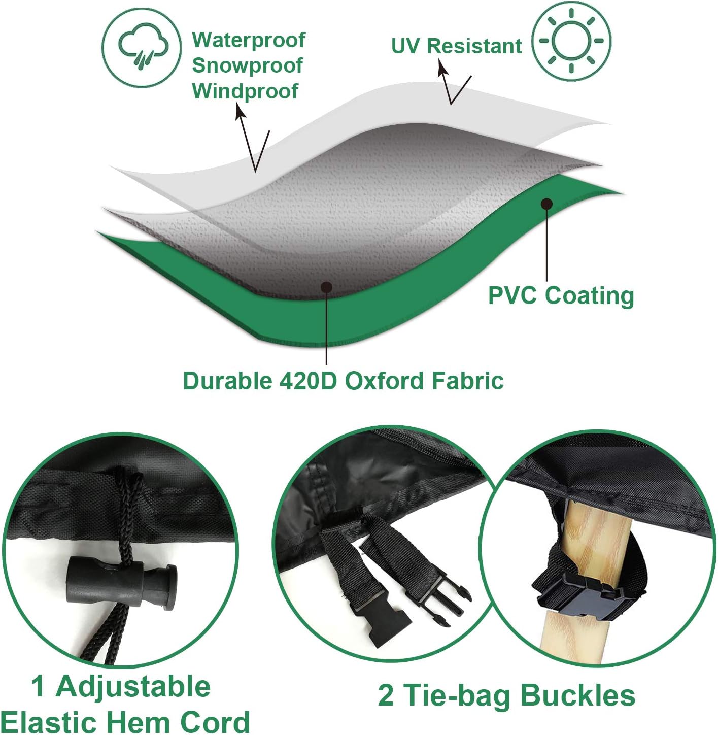 - 【Winddicht & UV-Schutz】 Es gibt die 2 Gurte mit Click-Verschluss und Verstellbare Seitengurte auf dem Schutzhülle, um den Schutz an den windigsten Tagen zu gewährleisten. Die innere Schicht hat eine Silberbeschichtung, das UV-beständige Design