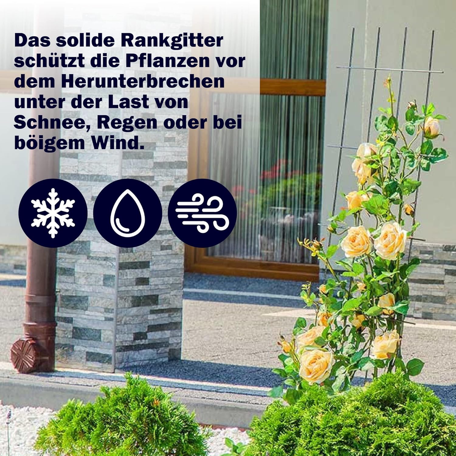 - DIE SOLIDE ANFERTIGUNG DES GITTERS AUS 5MM-DRAHT SORGT FÜR EINE STEIFE UND ROBUSTE KONSTRUKTION. Die pulverbeschichtete Farbe mit UV-Filter schützt die Rankgitter wirksam vor Korrosion. Dadurch ist unsere Stütze gegen die negative Einwirkung von