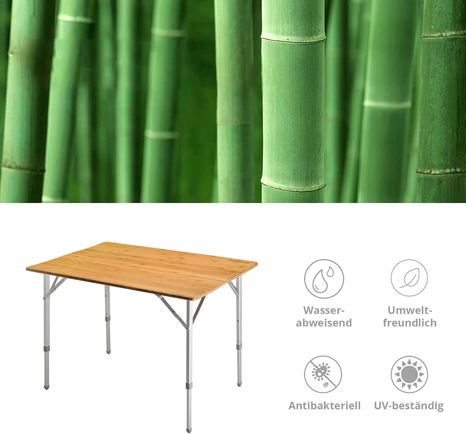 - Material Tischplatte: Bambus. Material Gestänge: Aluminium. Masse Tischplatte: 100 x 72 cm. Höhe: 48-70 cm