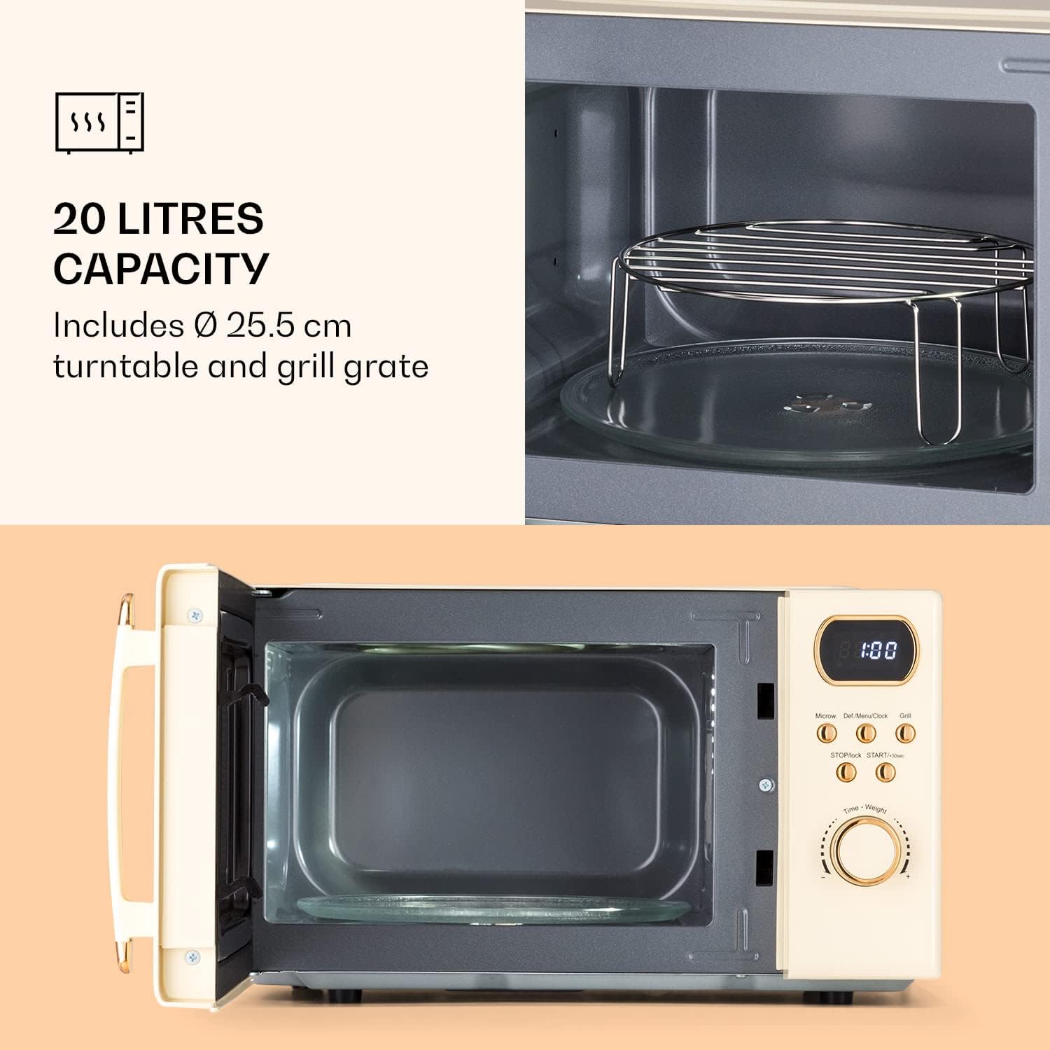 - GROSSER GRILL-DREHTELLER: Diese kleine Mikrowelle mit 20 Liter-Volumen ist die ideale Ergänzung auch beim Camping, denn diese Mikrowelle ist klein und platzsparend. Ausgestattet mit einem hochwertigen 25,5cm Drehteller und einer Grillplatte von 21cm.