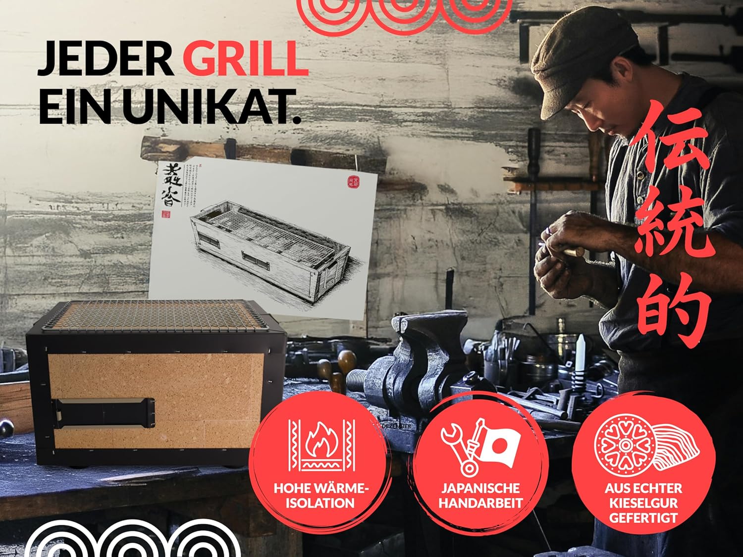 - Japanische Handwerkskunst von Suzu - Jeder Grill ist ein Unikat: aus natürlichen Kieselgurblöcken, bei 1000 °C gebrannt, mit höchster Präzision zusammengebaut. Ein langlebiges Premium-Produkt für authentisches Grillvergnügen.
