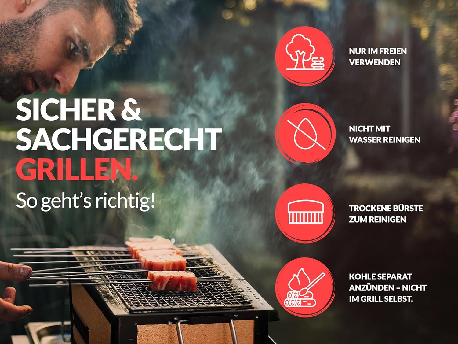- Wichtige Gebrauchsanweisung: Grill nur im Freien oder gut belüfteten Räumen verwenden. Nicht mit Wasser reinigen. Kohle immer aussen glühen und nur mit Zange einsetzen. Nur trocken mit Bürste reinigen.