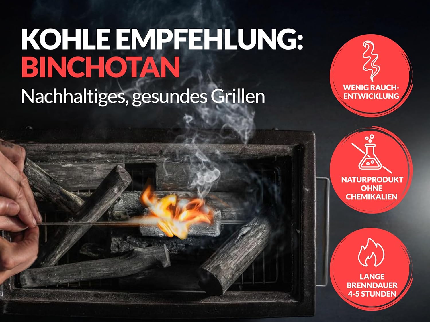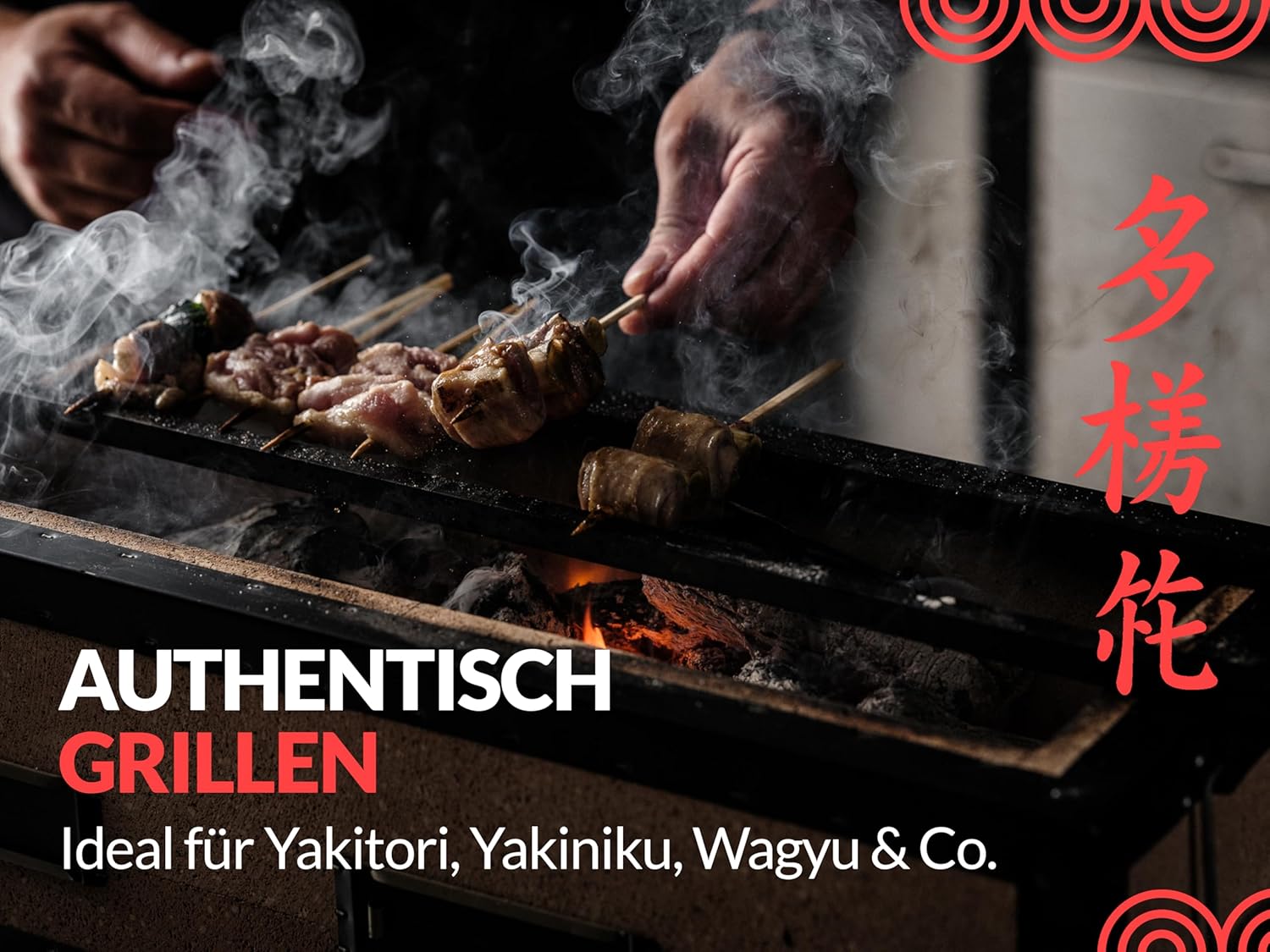 - EMPFOHLEN MIT BINCHOTANKOHLE – Die japanische "weisse Holzkohle" sorgt für extreme Hitze, lange Brenndauer (bis zu 5 Stunden) und nahezu geruchloses Grillen. Ideal für delikate Aromen wie Fisch, Fleisch, Gemüse und mehr.