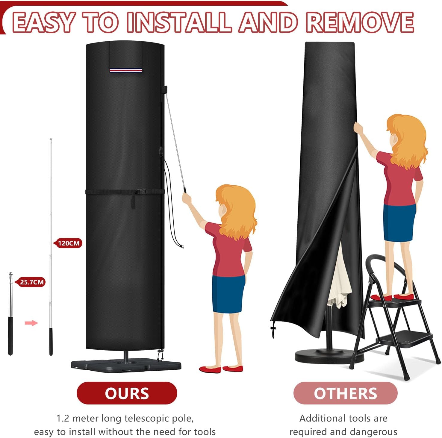 - ↪【Winddichte Sonnenschirmhülle mit Stab】Jede Sonnenschirm abdeckung hat eine 1,2m lange Teleskopstange und einen 2m langen wasserdichten Reissverschluss für einfache Montage und Demontage. Die Teleskopstange ermöglicht es Ihnen, die ampelschirm