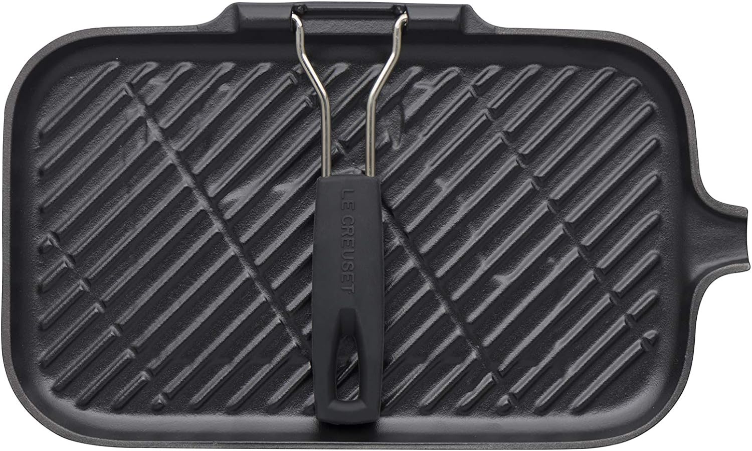 - Rechteckige Gusseisen-Grillplatte mit Rippen und klappbarem Griff zum Grillen von Hähnchen, Steaks, Fisch und Gemüse, Mit mattschwarzer Innenemaillierung