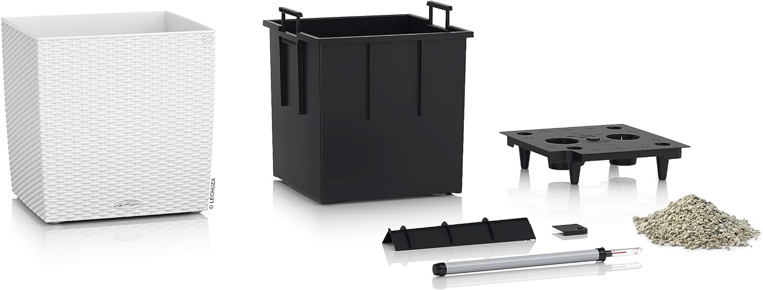 - ALL-IN-ONE: 1x Pflanzgefäss CUBECottage, inkl. Bewässerungssystem, Pflanzsubstrat LECHUZA-PON als Drainageschicht und wechselbarem Pflanzeinsatz mit versenkbaren Griffen und Wasserstandsanzeiger. Material: Kunststoff Masse: 39 x 39 x 40 cm