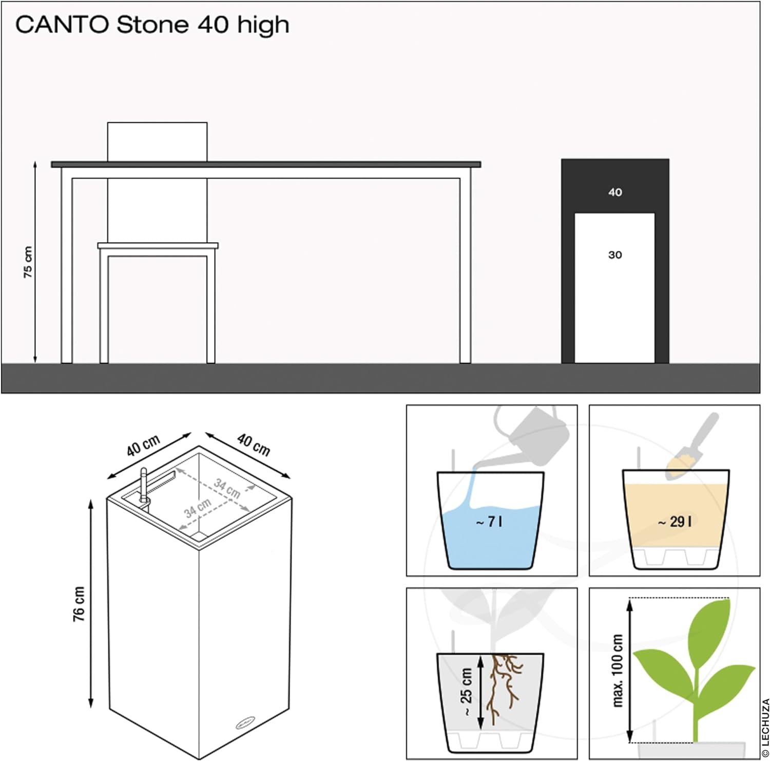 - Lieferumfang: 1x Lechuza CANTO Stone High 40, Inkl. Bewässerungssystem, Material: Kunststoff, Masse: 40 x 40 x 76 cm, Pflanzeinsatz: 34 x 34 cm, Pflanzvolumen: 29 l