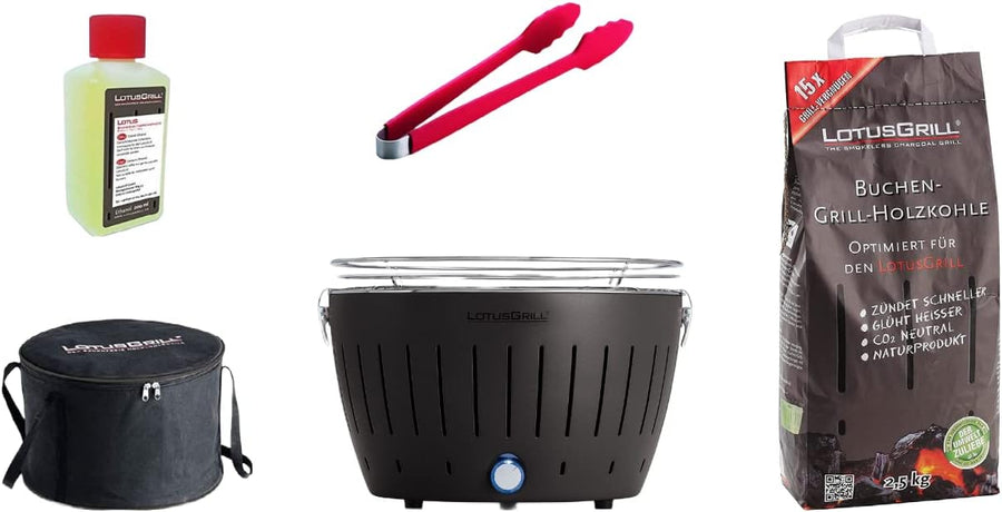 - Lieferumfang: 1x LotusGrill mit USB-Anschluss, 1x LotusGrill Tragetasche, 1x Buchenholzkohle 2,5 kg, 1x Brennpaste 200ml, 1x Würstchenzange (Farbe nach Vorrat), 4 x Mignon Batterien, 1x Gebrauchsanweisung
