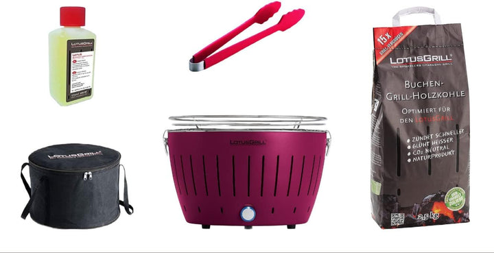 - Lieferumfang: 1x LotusGrill mit USB-Anschluss, 1x LotusGrill Tragetasche, 1x Buchenholzkohle 2,5 kg, 1x Brennpaste 200ml, 1x Würstchenzange (Farbe nach Vorrat), 4 x Mignon Batterien, 1x Gebrauchsanweisung