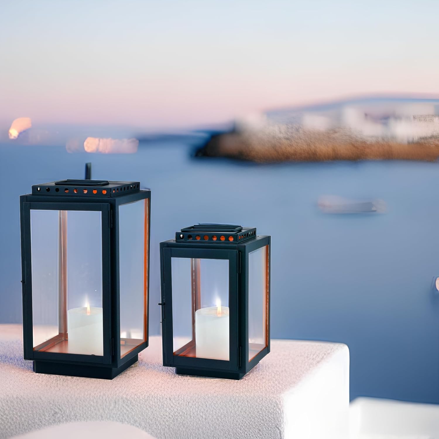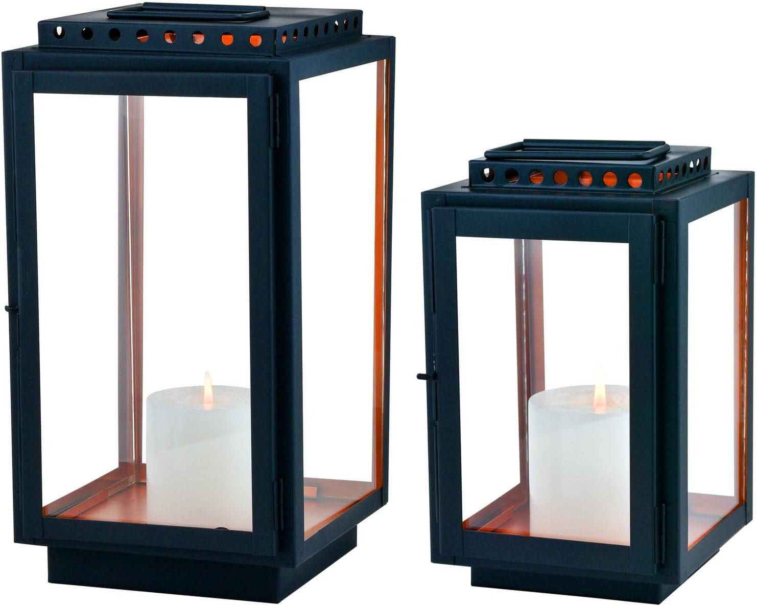 - Grösse Grosse Laterne: 34,5 cm hoch 18cm tief und 18,5cm breit | Grösse kleine Laterne: 24cm hoch 15cm tief und 15cm breit | Material: Metall & klares Glas. Farbe: Schwarz von aussen und Kupferfarbig von Innen | Diese Windlichter haben ein Türchen um