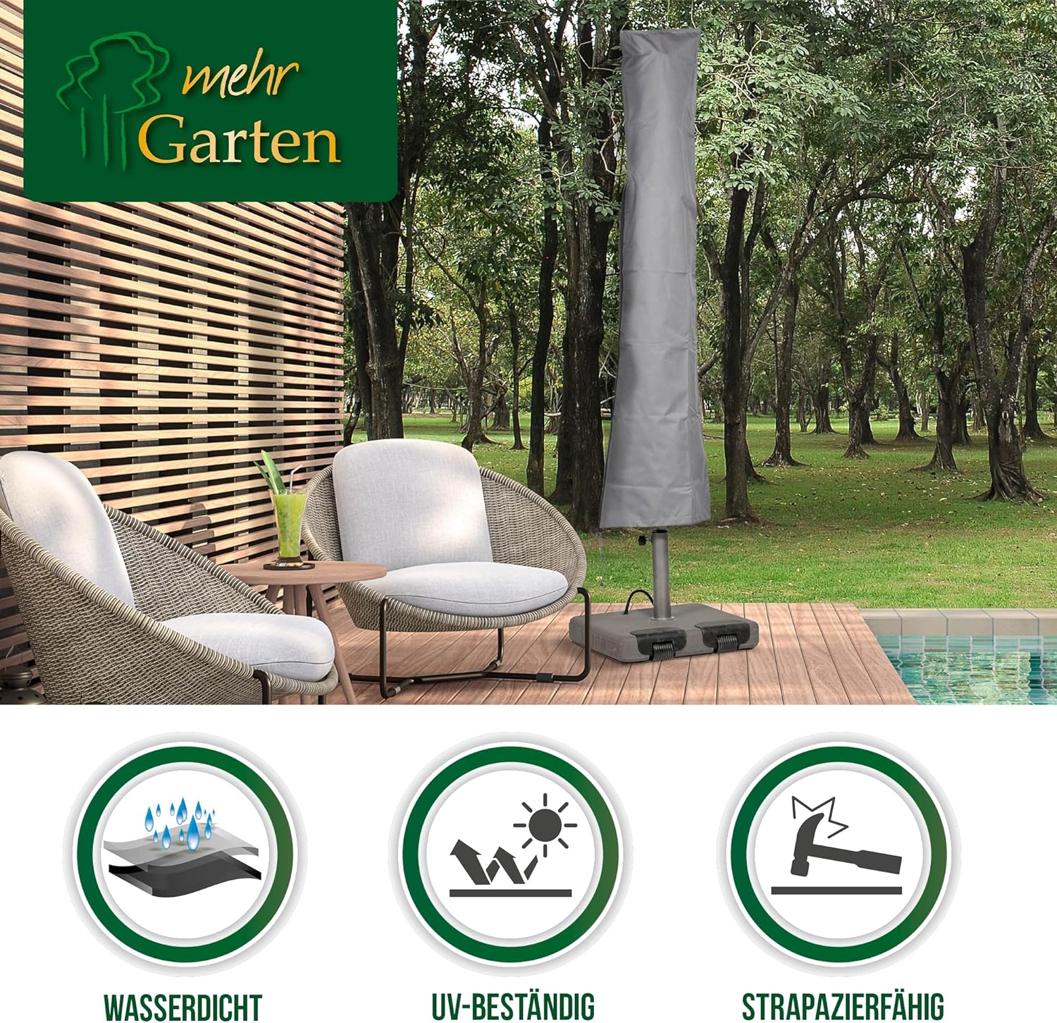 - ROBUST & WINTERFEST: Das Gewebe dieser Schirm Abdeckung ist nicht nur robust und reissfest, sondern auch frostbeständig. So können Sie Ihren Schirm selbst in den kältesten Wintern geschützt draussen stehen lassen.