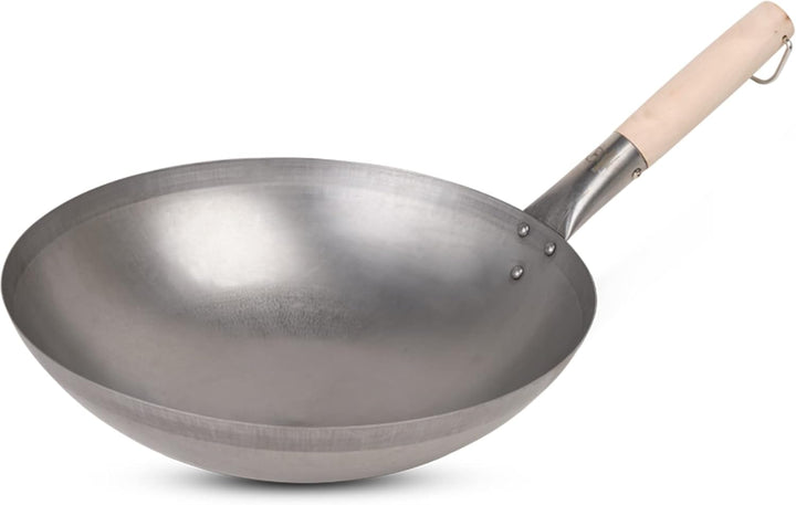 - Kinderleicht - Robuste 35 cm Wokpfanne mit Holzstiel, gefertigt aus 1mm dickem Stahl erzielt auf dem Kugelgriff in Kombination mit mitgeliefertem Zubehör schnell und einfach optimale Grillergebnisse