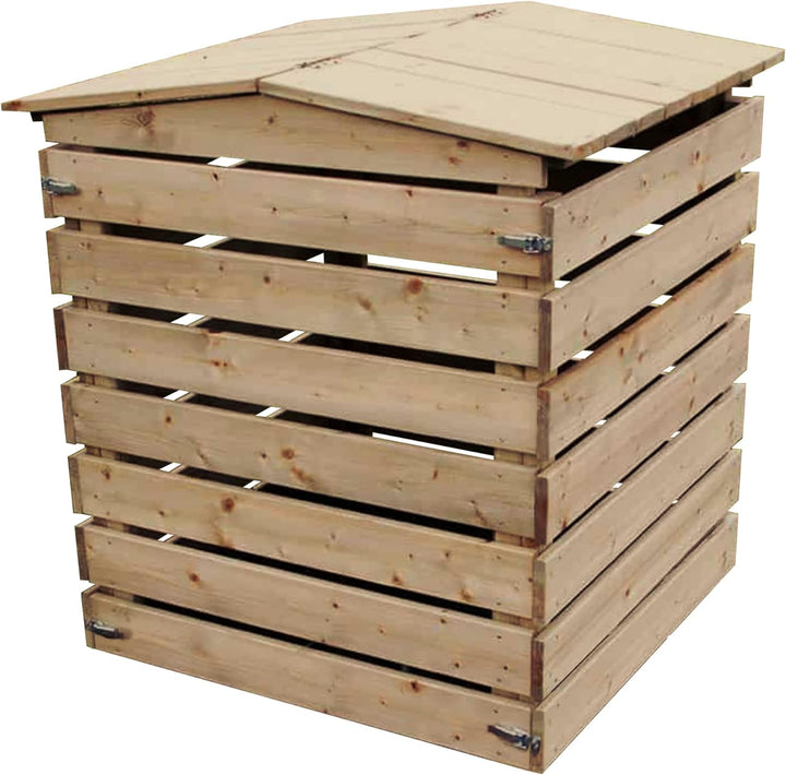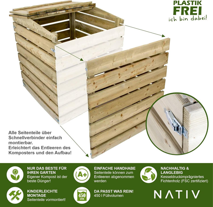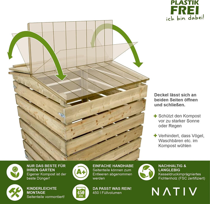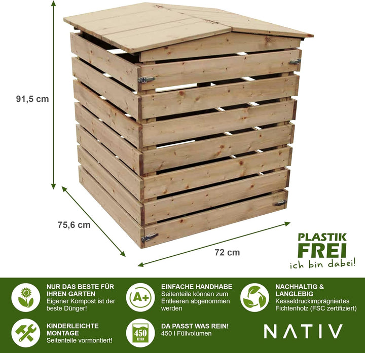 - DETAILS: Komposter aus Fichtenholz (FSC zertifiziert, kesseldruckimprägniert), 75,6x72x91,5cm (LxBxH), 2cm Wandstärke, 450l Füllvolumen, 30kg Gewicht; mit Deckel und 4 abnehmbaren Seitenteilen