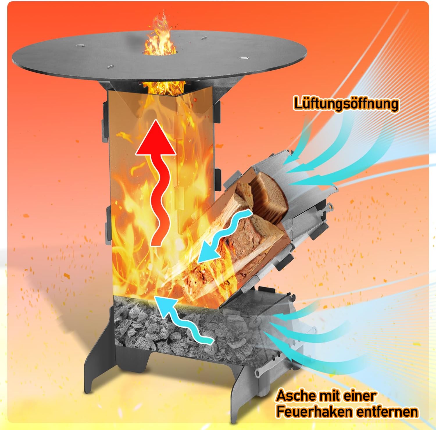 - đ„ăSTABILITĂTă: Raketenofen mit 2 zusĂ€tzlichen StandfĂŒssen, die den Landebereich vergrössern, das Produkt ist stabiler im Gebrauch, nicht leicht zu kippen oder zu verbiegen. Mehr Sicherheit im Gebrauch.