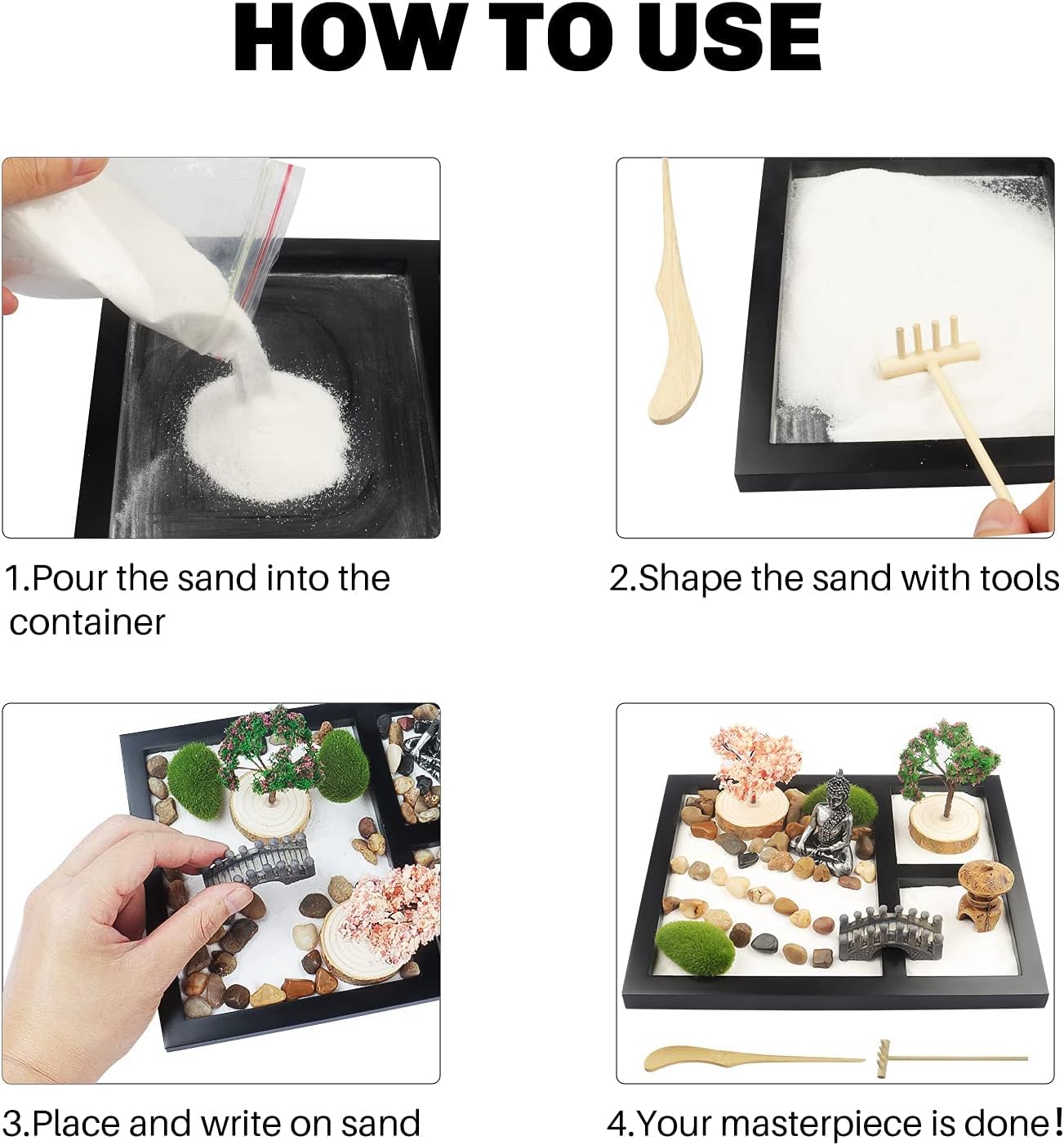 - [Bereichern Sie Kreativität] -- Verwenden Sie unseren Mini-Indoor-Garten als Fidget-Spielzeug. Verwenden Sie die Rechen, um Muster im Sand zu kreieren und Angst zu lindern, während Sie mehr Fokus und kreativen Fluss entwickeln.
