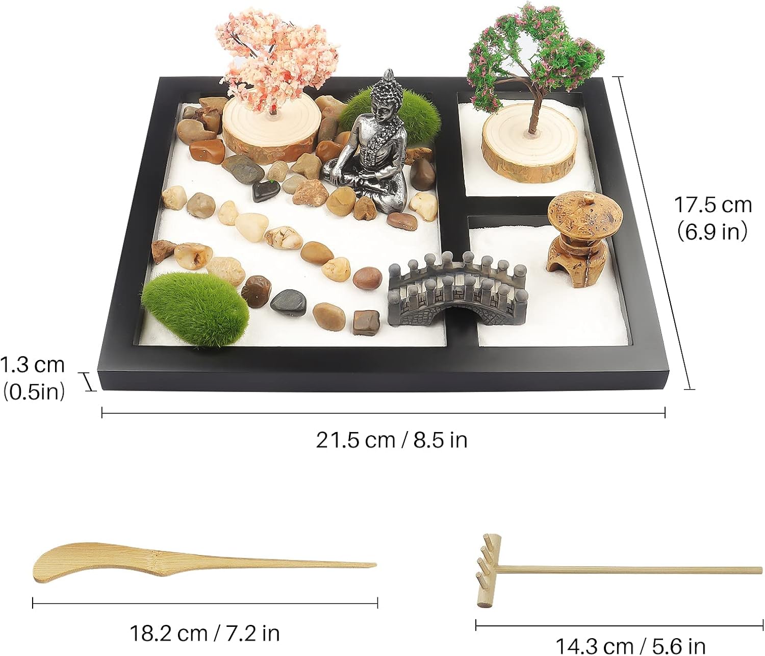 - Hochwertiges Zen-Kunst-Set: Holen Sie sich ein hochwertiges Bambus-Tablett mit Sand, Zen-Steinen, einem Rechen, einem Sandstempel. Viel mehr Zen-Gartenzubehör als herkömmliche Zen-Gärten.
