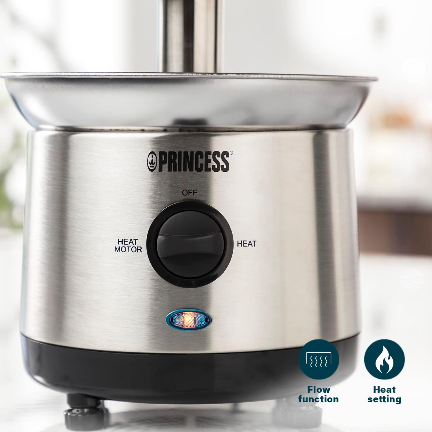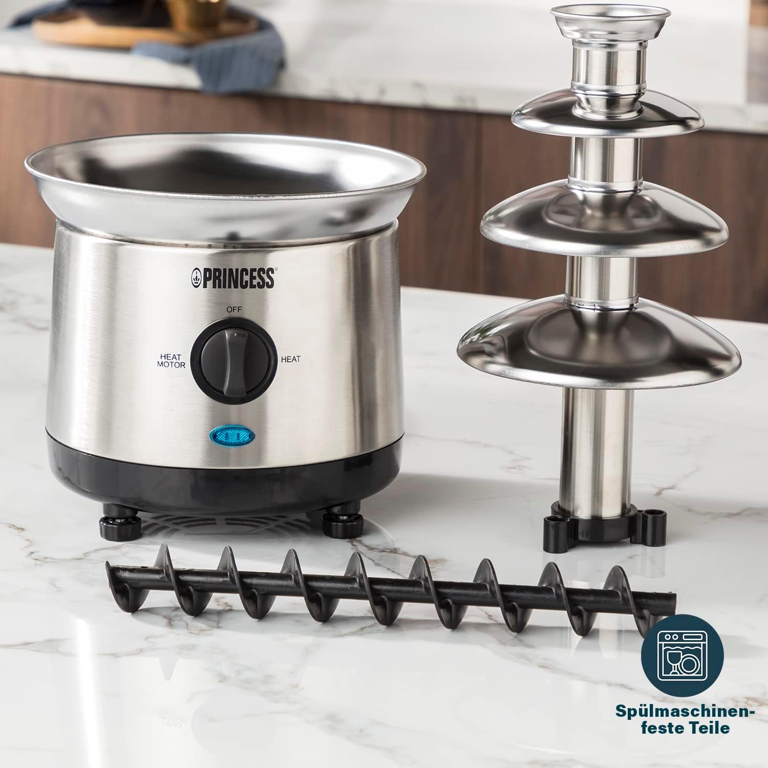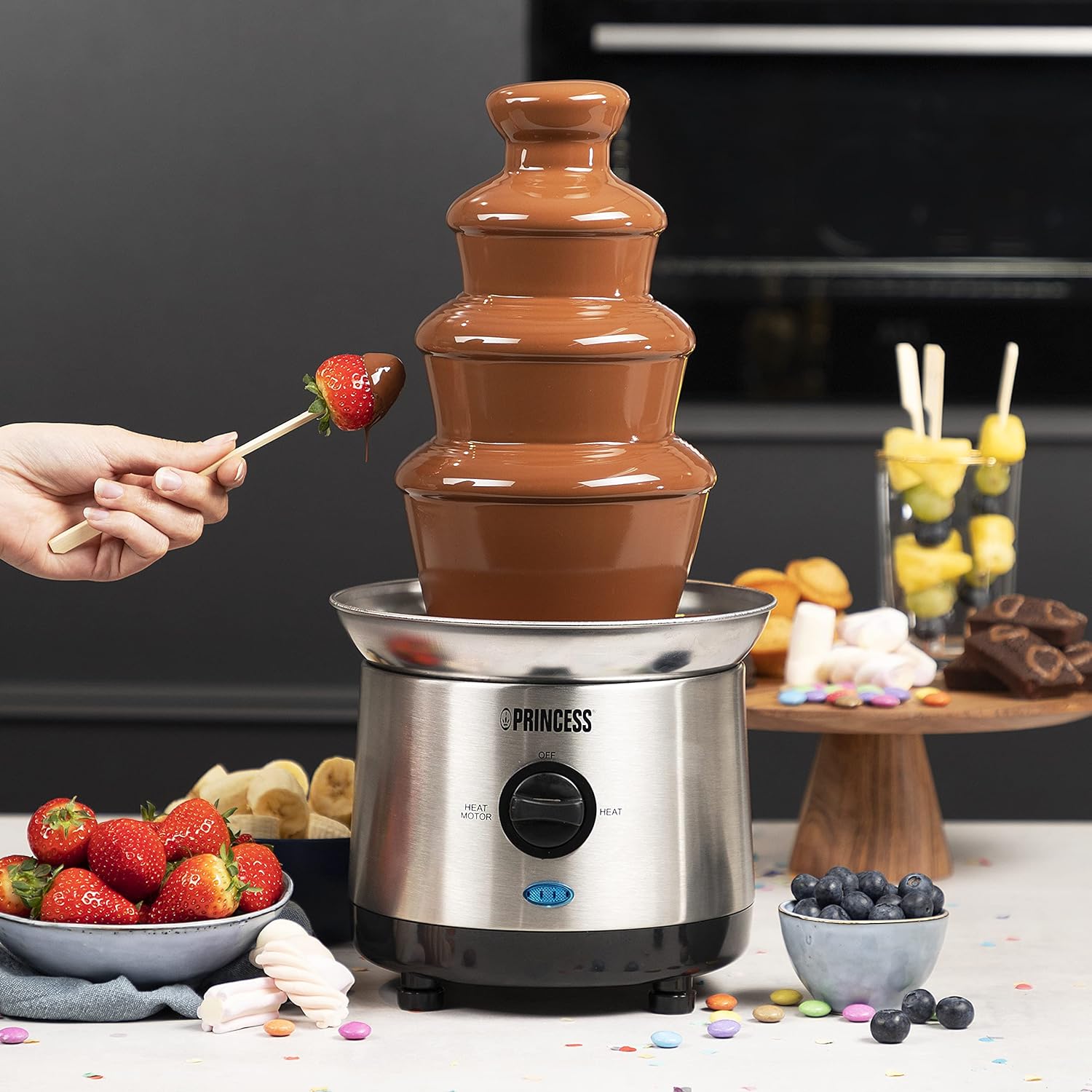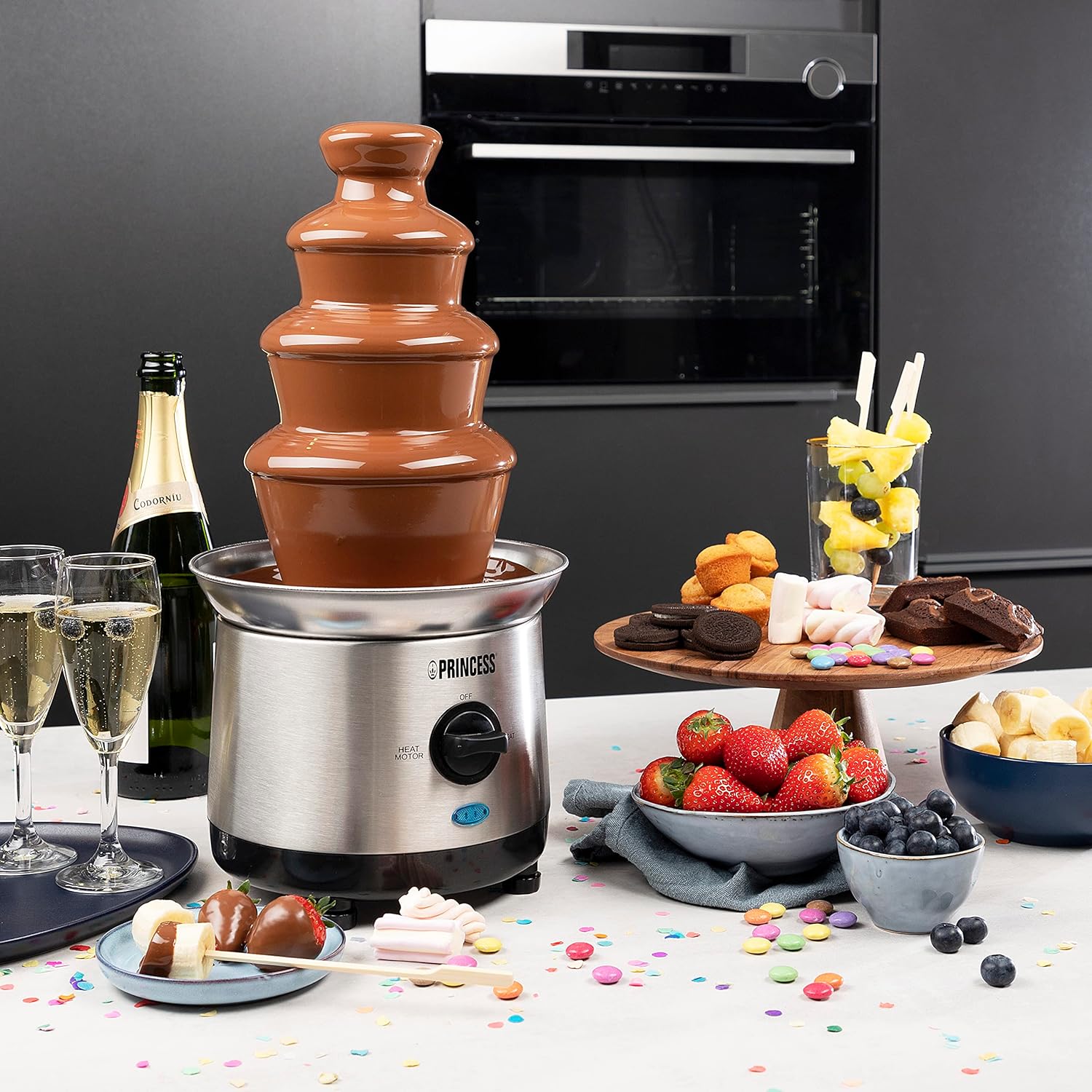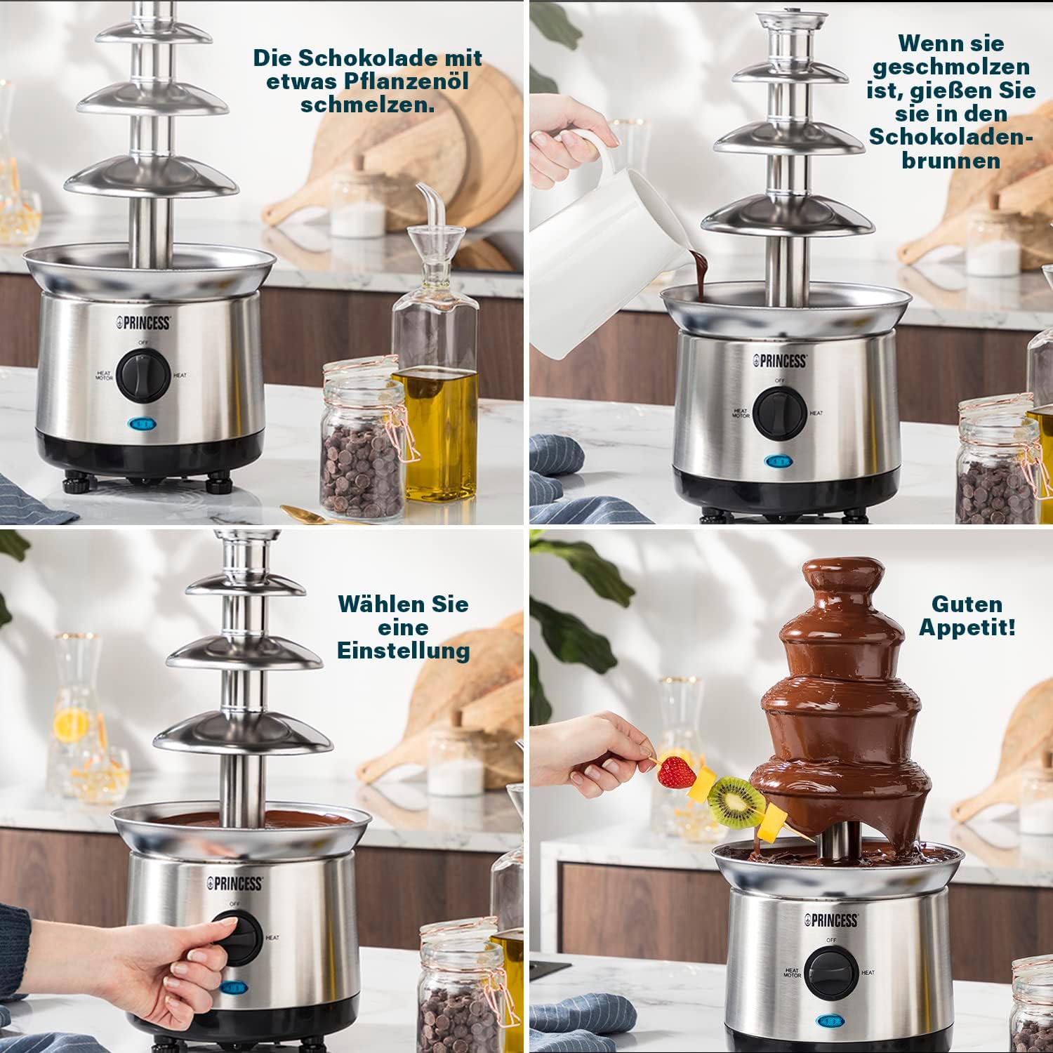- Der Princess Schokoladenbrunnen ist ein Highlight bei jeder Party. Der 190 Watt starke Motor transportiert die flüssige Schokolade zur obersten Ebene, von wo die Schokolade über 4 Ebenen hinunter fliessen kann