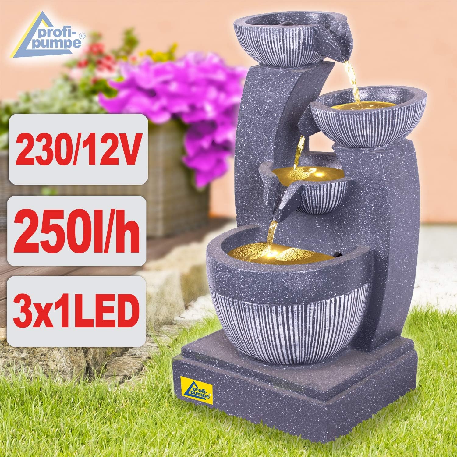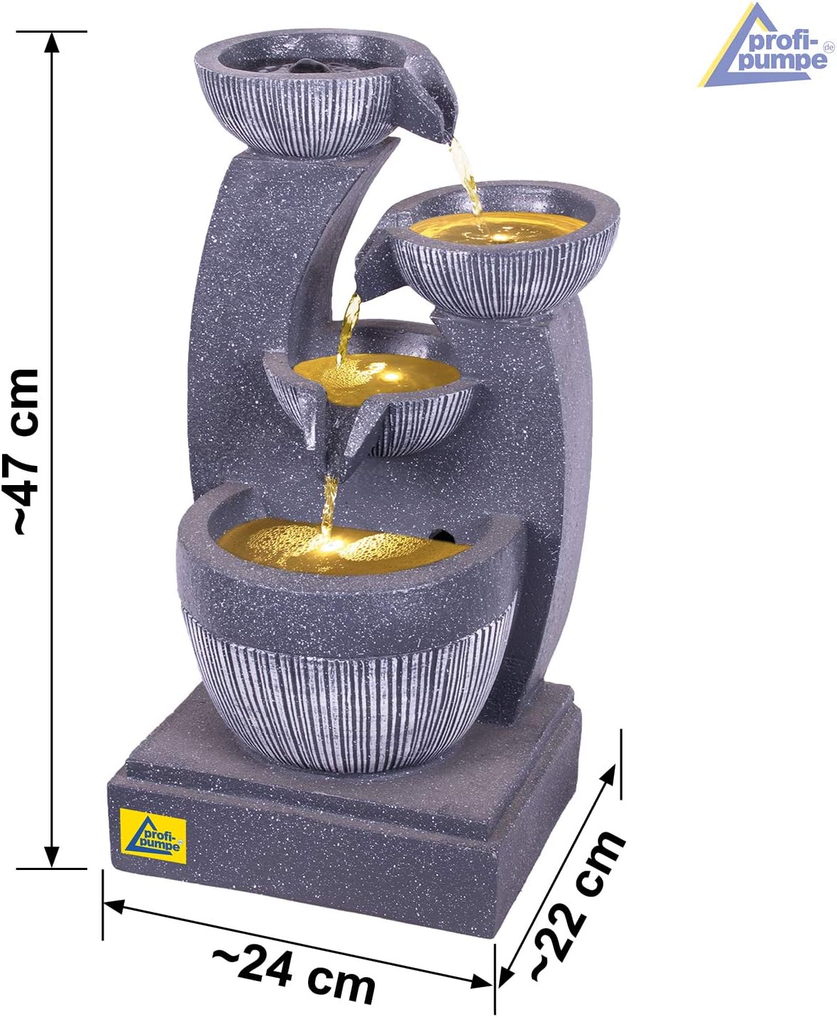 - Der Brunnen ist sowohl bei Tag als auch bei Nacht der perfekte Hingucker. Die mitgelieferte LED-Beleuchtung sorgt für die perfekte Illumination. Die LED-Lichter des austauschbaren LED-Rings erstrahlen in klassichem Weiss.