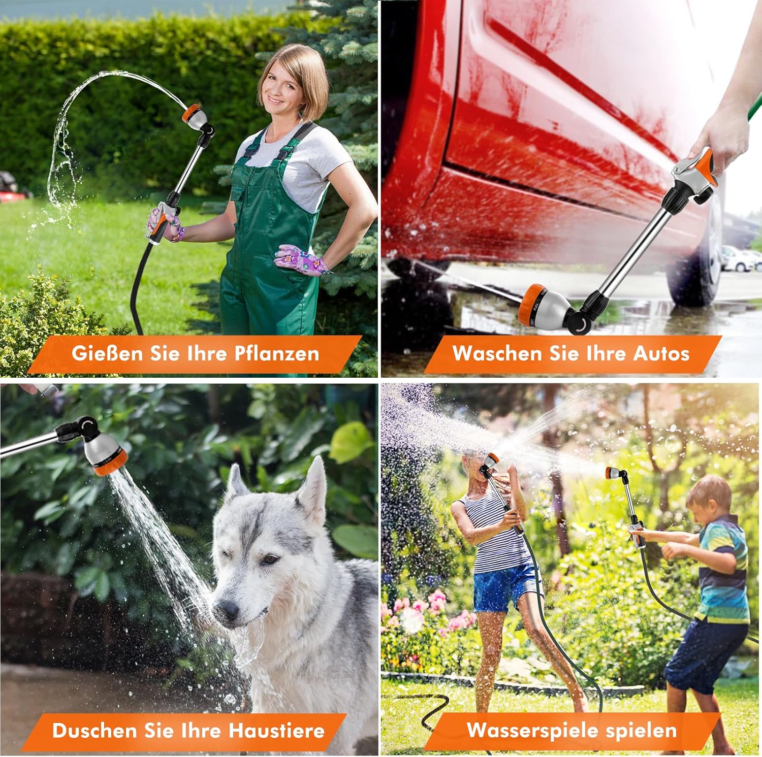 - 7 WÄSSERUNGSMUSTER - Drehen Sie das Wählrad des Sprühkopfes, um ein Wassermuster aus Dusche, Strahl, Flach, Mitte, Kegel, Voll und Nebel auszuwählen. Ganz gleich, ob Sie den Hochdruckstrahl zum Reinigen Ihrer Fenster und des Daches oder die sanfte