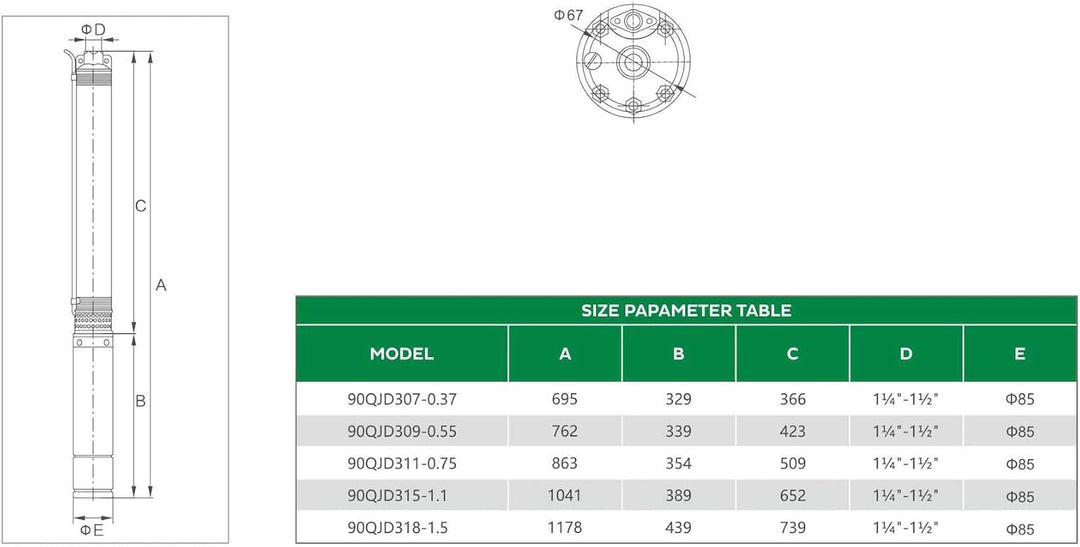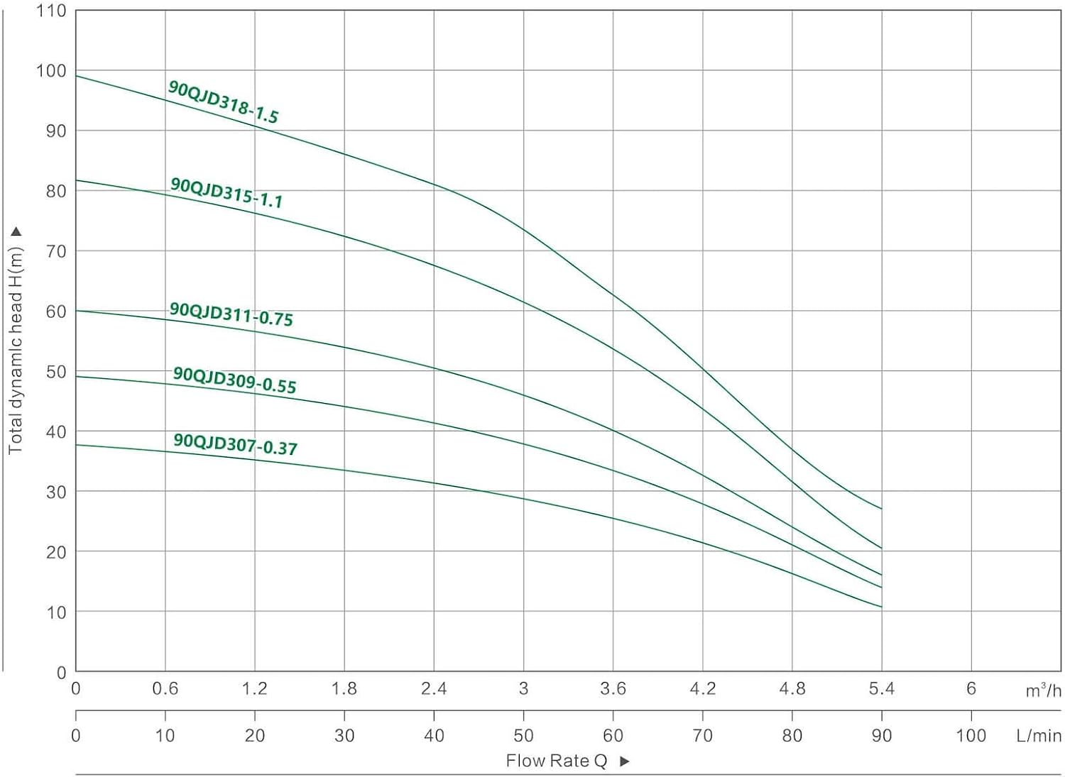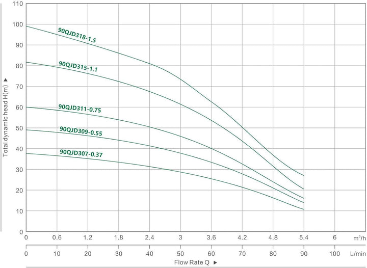 - Technische Daten: Typ: SK90QJD318-1.5 (sandresistent < 5%) // Spannung: 230V/50 Hz // Leistung: 1,5kW / 8,3 A // Max. Fördermenge (Qmax.): 5800 Liter/h (entspricht 97 Liter/min bzw. 5,8 m³/h) / Max. Förderhöhe (Hmax.): 98 m // Pumpenlänge: 138 cm //