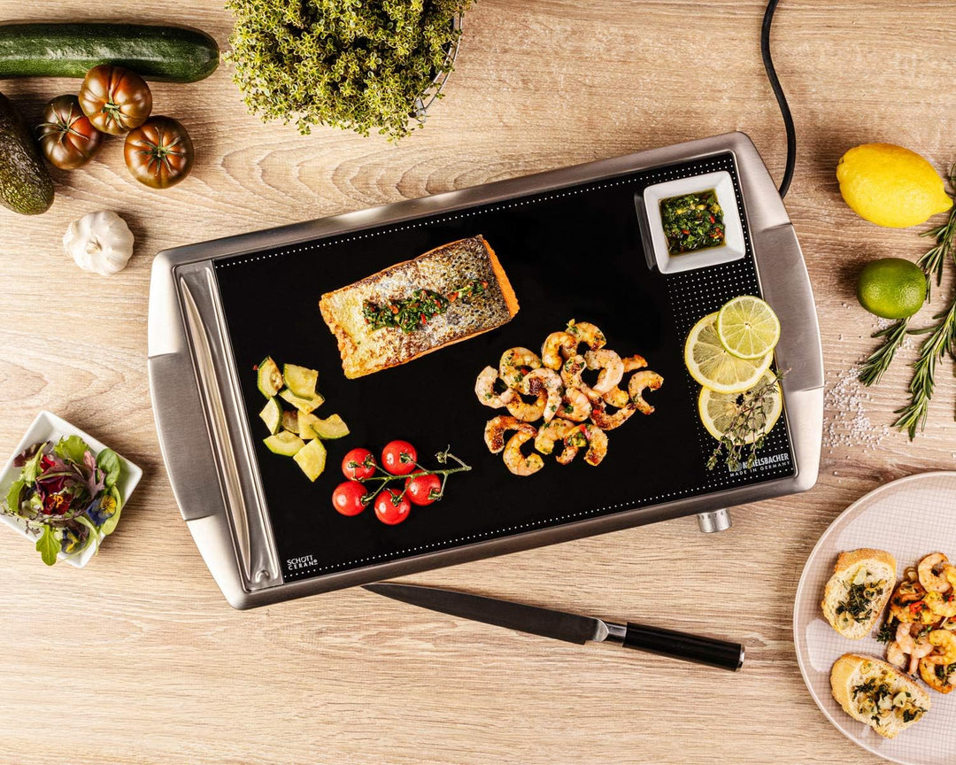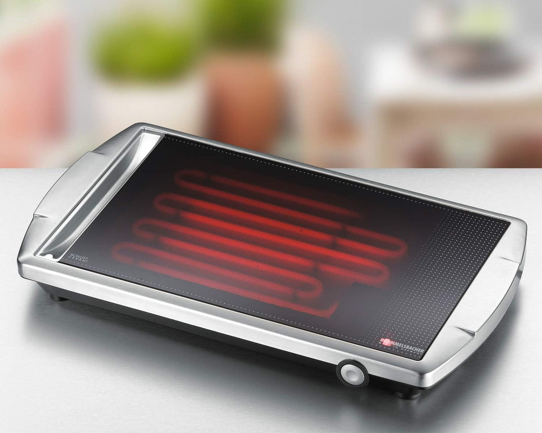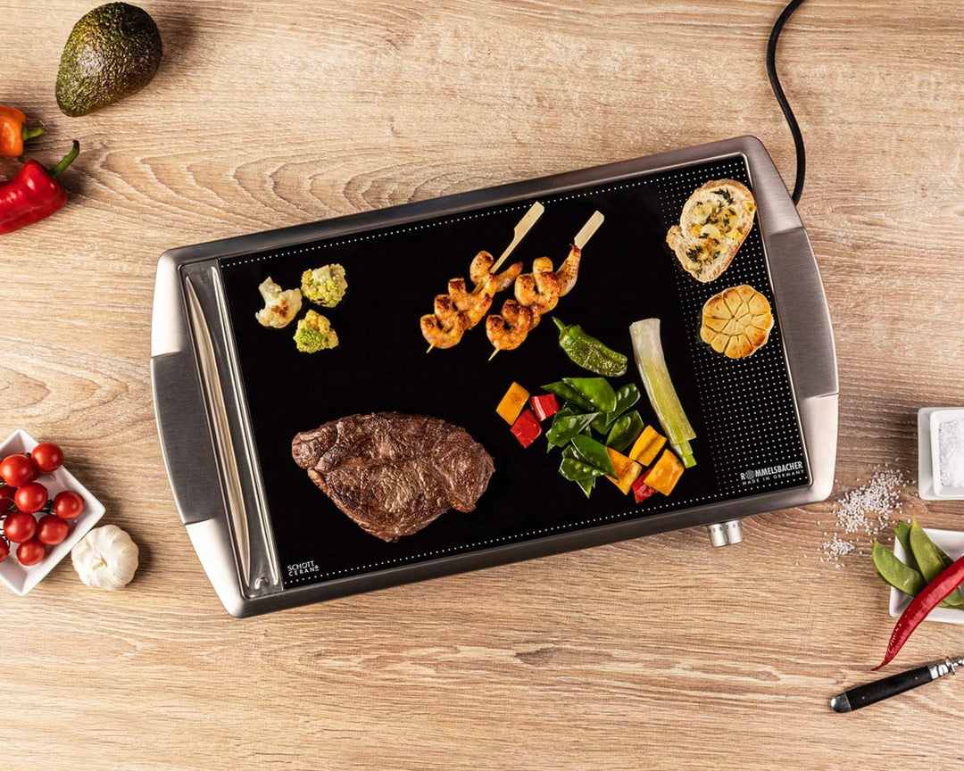 - Hochwertiges, pflegeleichtes Gehäuse aus gebürstetem Edelstahl, formschönes Softline Design, original SCHOTT CERAN Glaskeramik Grillfläche mit integrierter Warmhaltezone