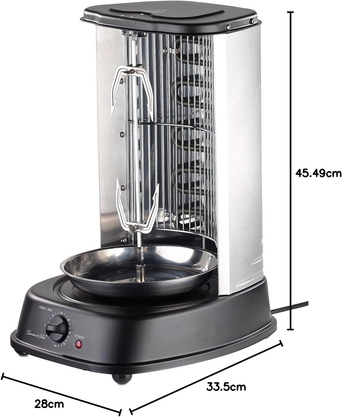 - Grillen Sie vertikal: So gelingen Kebab und Gyros knusprig und saftig • Offene Bauweise für direktes Servieren vom Spiess • Doppelwandiger Edelstahlreflektor mit Schutzgitter • Timer für minutengenaue Zubereitung