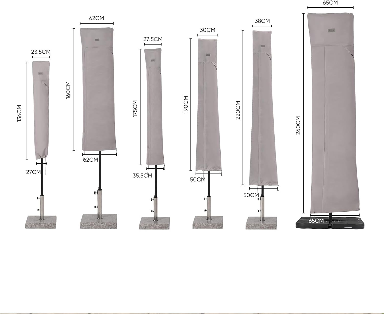 - HINWEIS: Wie ist die Dimensionsangabe zu verstehen? Am Beispiel 190 x 30/50cm: Mit 190cm ist die Länge der Schutzhülle gemeint. 30cm und 50cm bedeutet jeweils die Breite der Schutzhülle am oben und unten (NICHT Durchmesser).