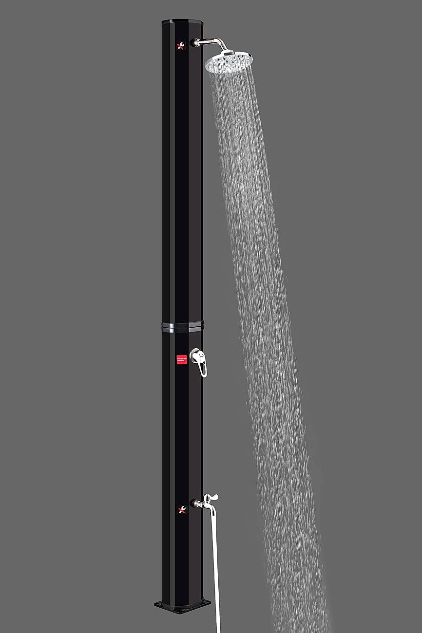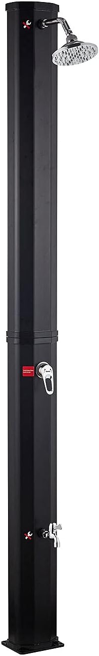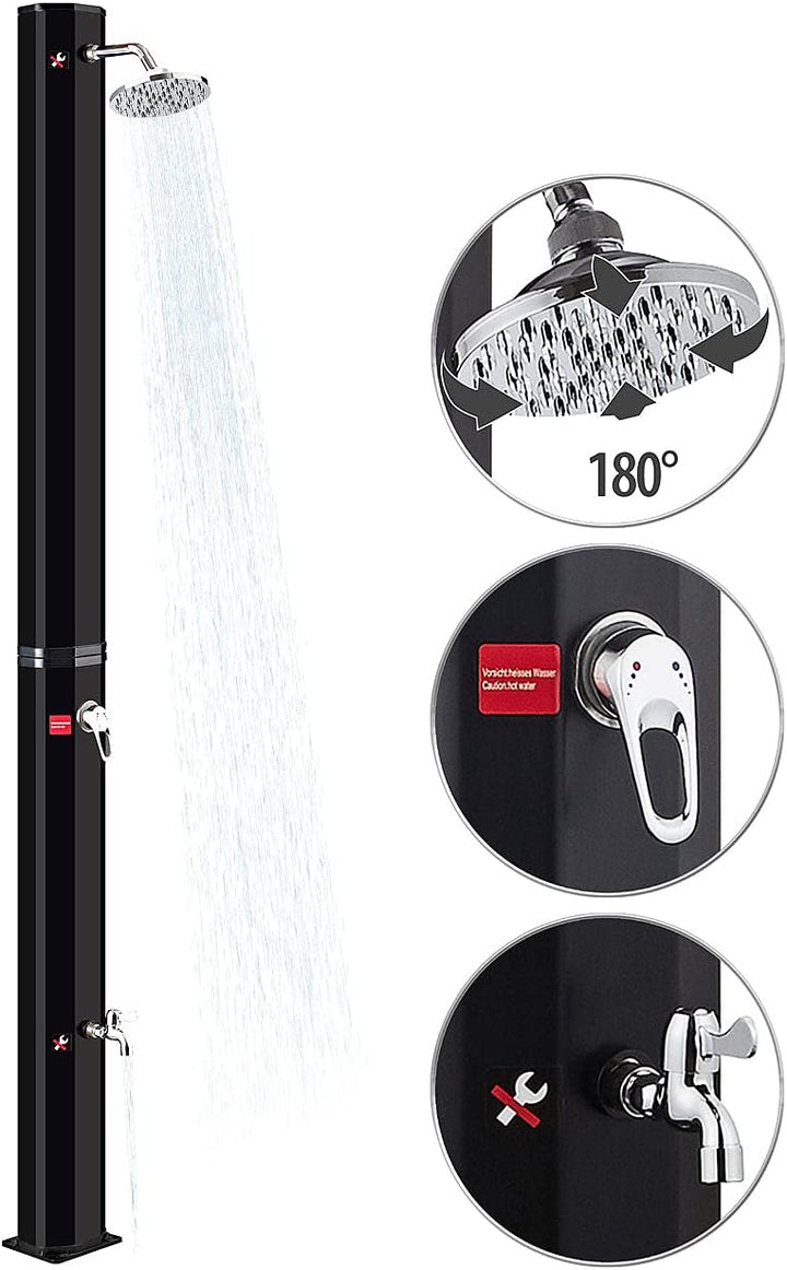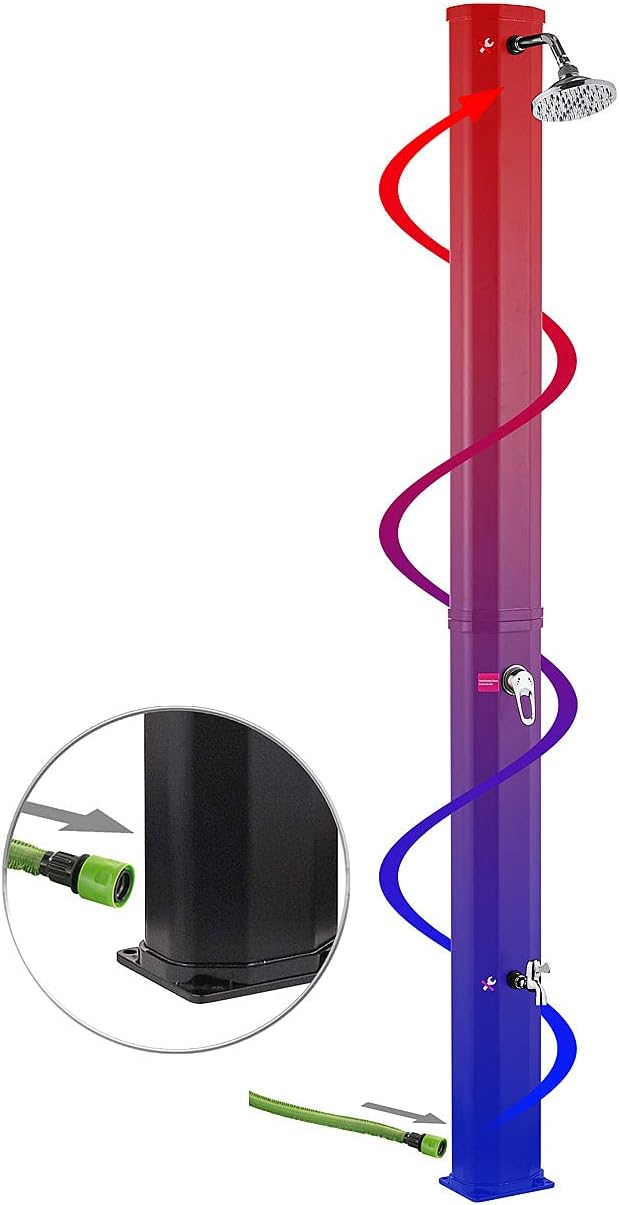 - Benötigt keinen Strom: Wasser erhitzt durch Sonnenenergie • Mit Anschluss an handelsüblichen Gartenschlauch • Sicherer Stand: Bodenplatte wird fest im Boden verankert