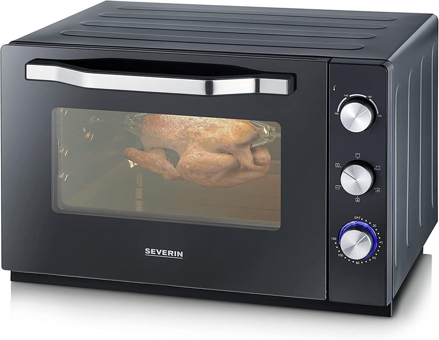 - Viel Zubehör – Neben einem Drehspiess für Fleisch gehören zu dem Backofen ein Grillrost, ein Backblech, ein Pizzastein, ein herausnehmbares Krümelblech sowie zwei Entnahmegriffe.