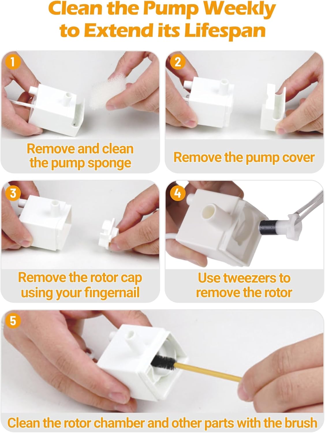 - Leicht zu reinigen: Die katzenbrunnen pumpe lässt sich zur einfachen Reinigung in Sekundenschnelle zerlegen. Bitte reinigen Sie die Pumpe wöchentlich, um ihre Lebensdauer zu verlängern.