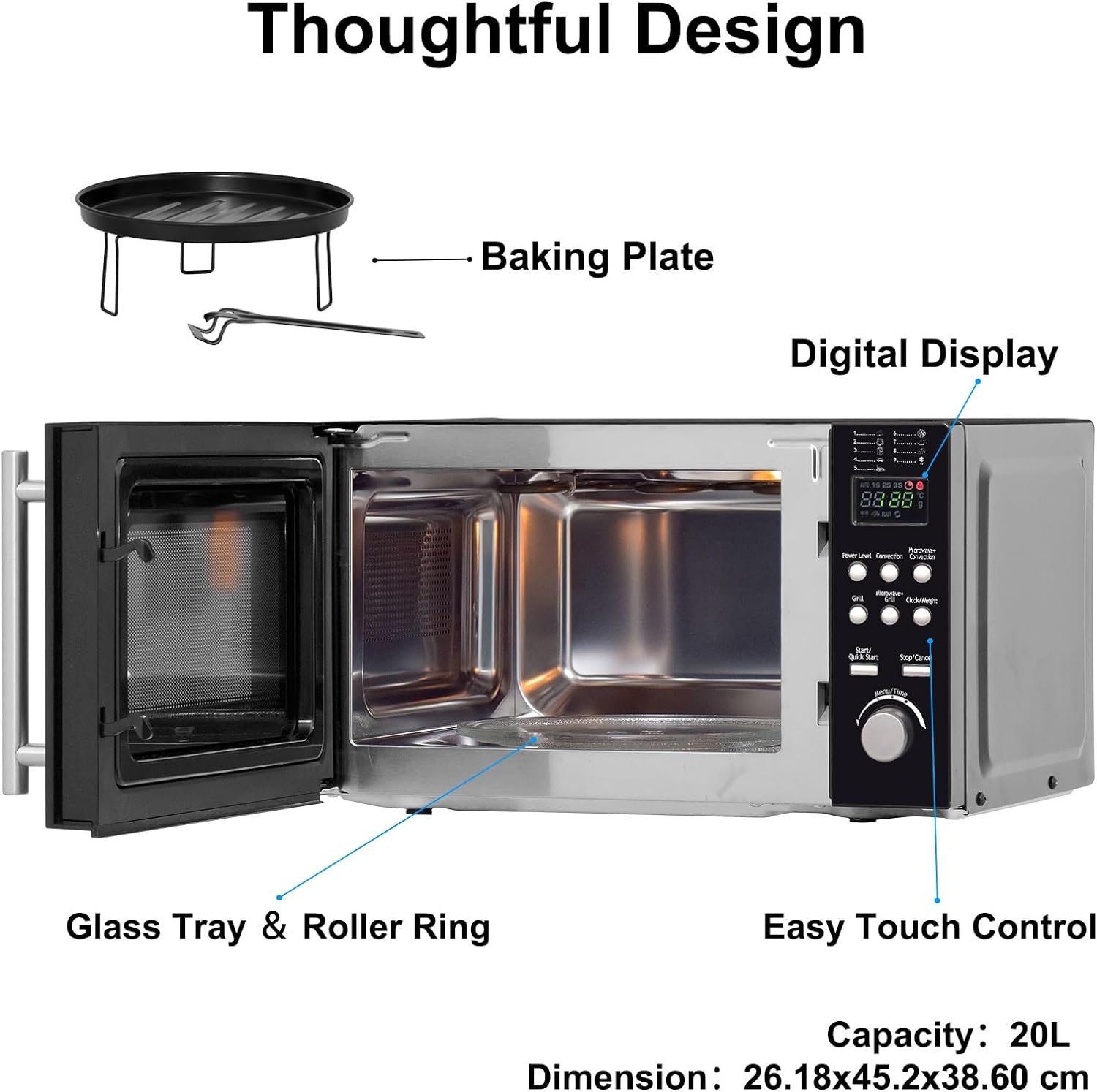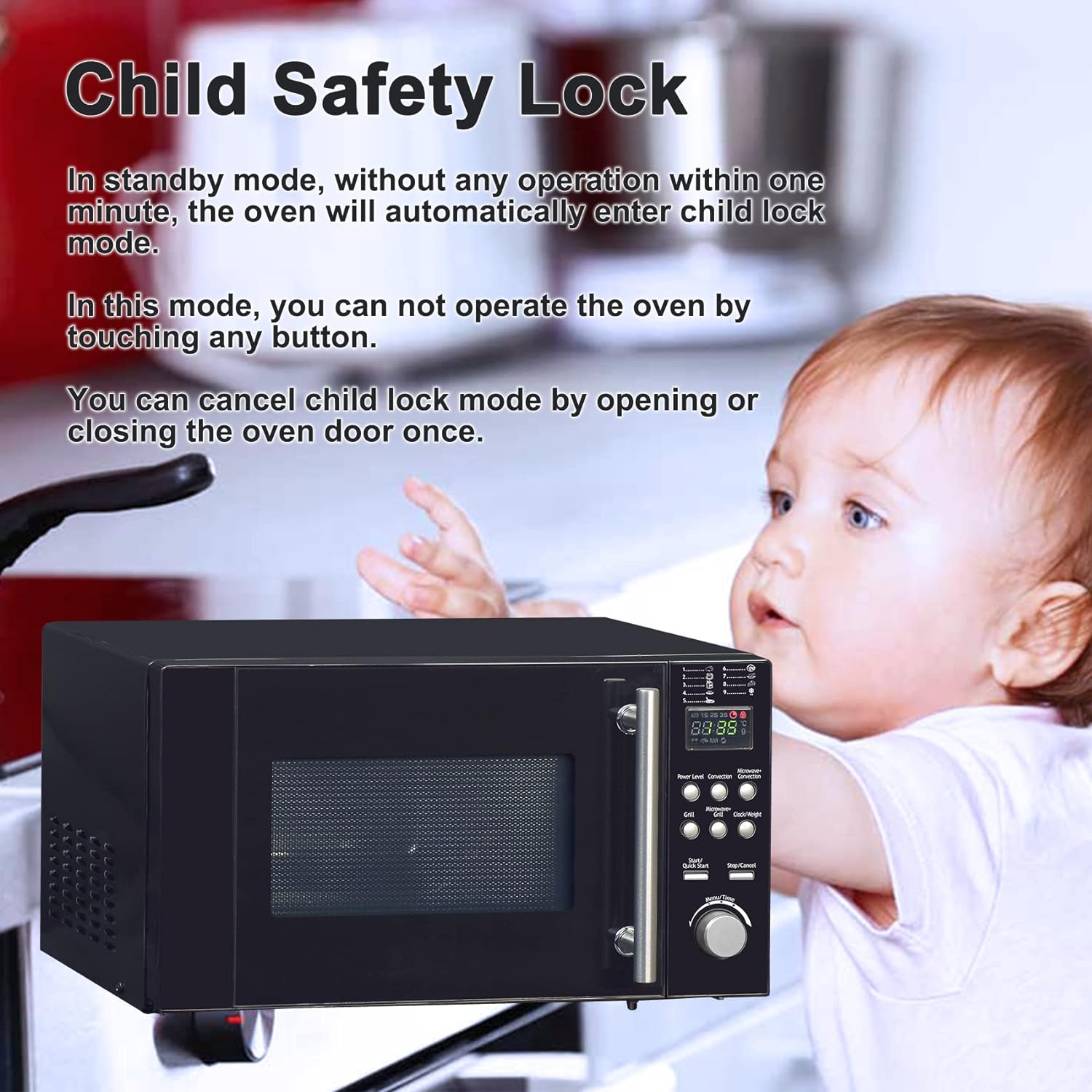- 🍚Mikrowelle mit Grill,mit Einfach zu Bedienender Touch-Steuerung und digitalem Display: Das einfach zu lesende LED-Uhrdisplay zeigt die Uhrzeit an, wenn die Mikrowelle nicht in Gebrauch ist, und verfügt über eine praktische Küchentimerfunktion (0-95 Minuten) und Kindersicherung.