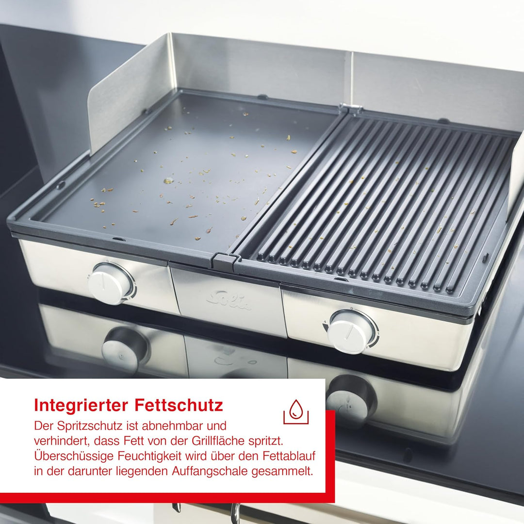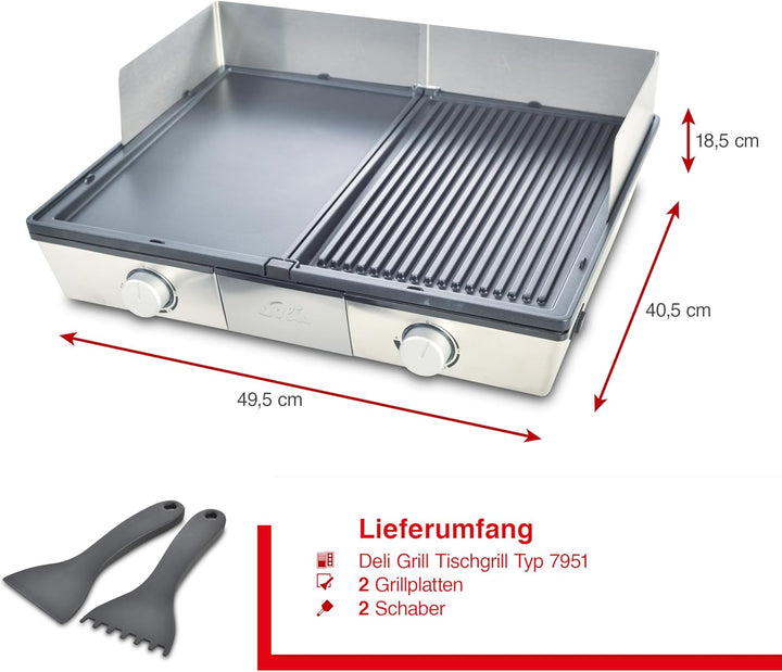 - LIEFERUMFANG - Solis Deli Grill 7951 Tischgrill, Inklusive Spritzschutz und 2 Spachteln, Masse: 49,5 x 18,5 x 40,5 cm