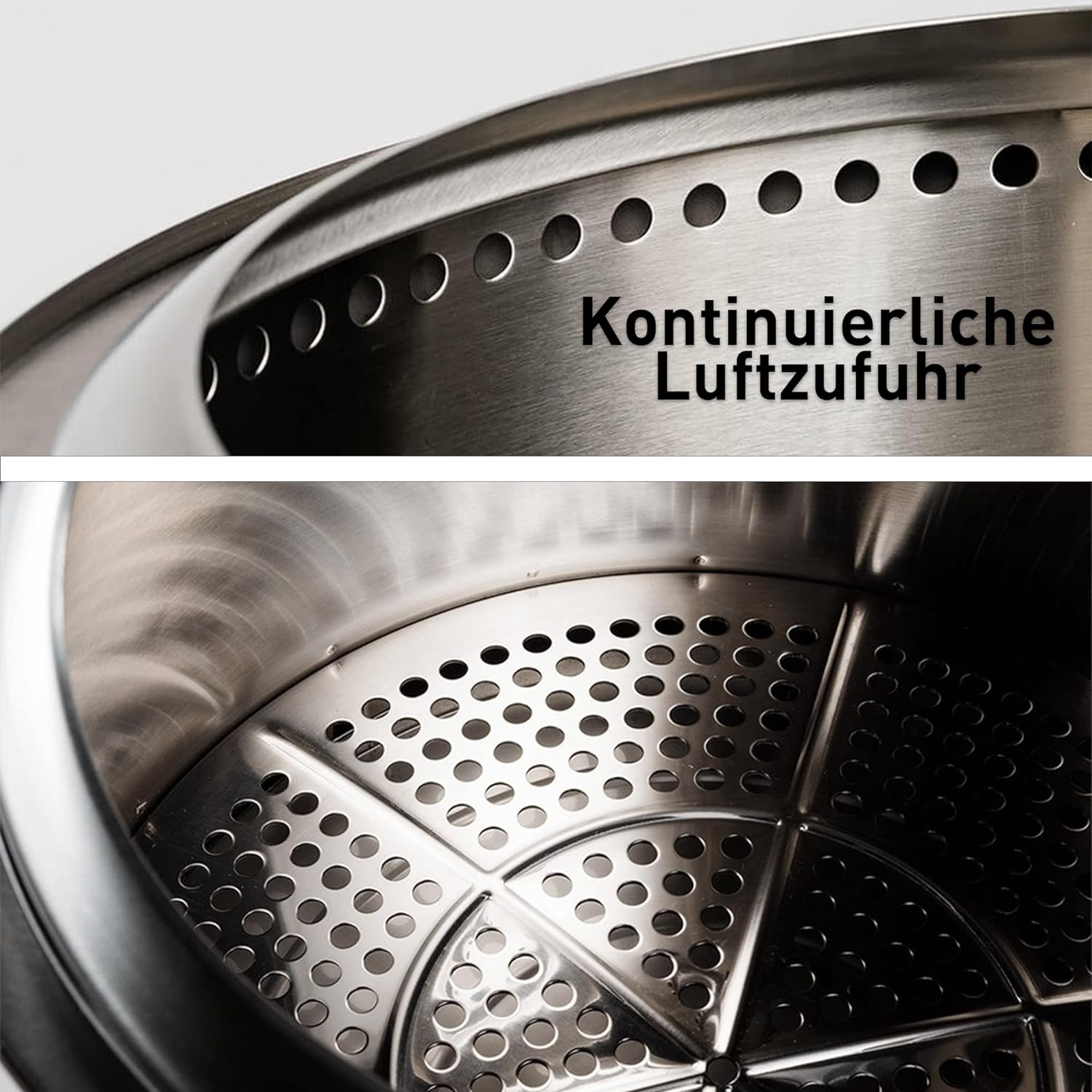 - Sekundäre Verbrennung: Eine doppelwandige Konstruktion optimiert die Verbrennung: Unten wird frischer Sauerstoff zugeführt, während warmer Sauerstoff zwischen den Wänden nach oben zurück ins Feuer steigt.