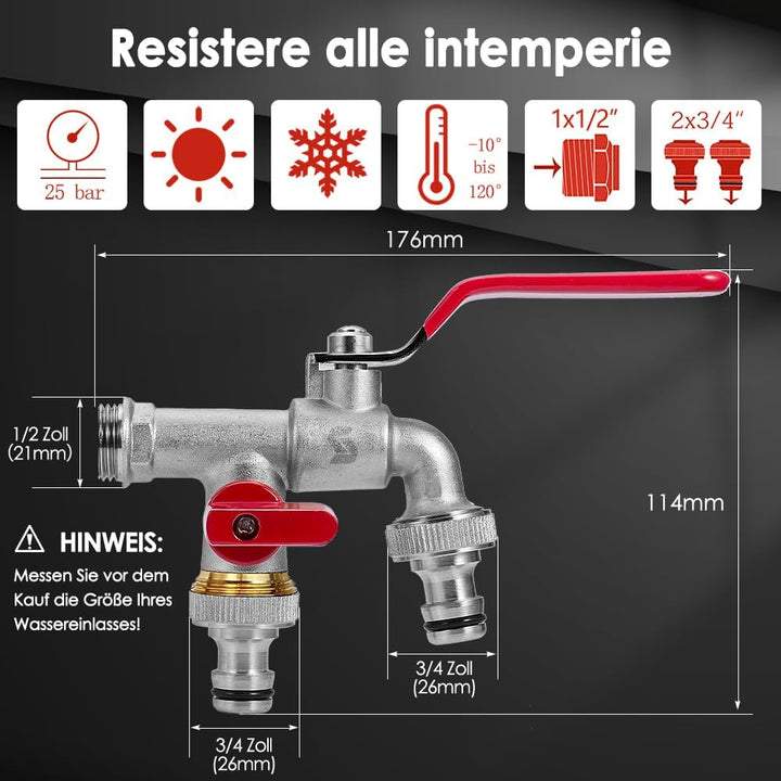 - Standardgrösse:Wasserhahn für den Aussenbereich Standard 1x 1/2 Einlass und 2x -3/4 Auslass können zwei Schlauchverteiler gleichzeitig anschliessen