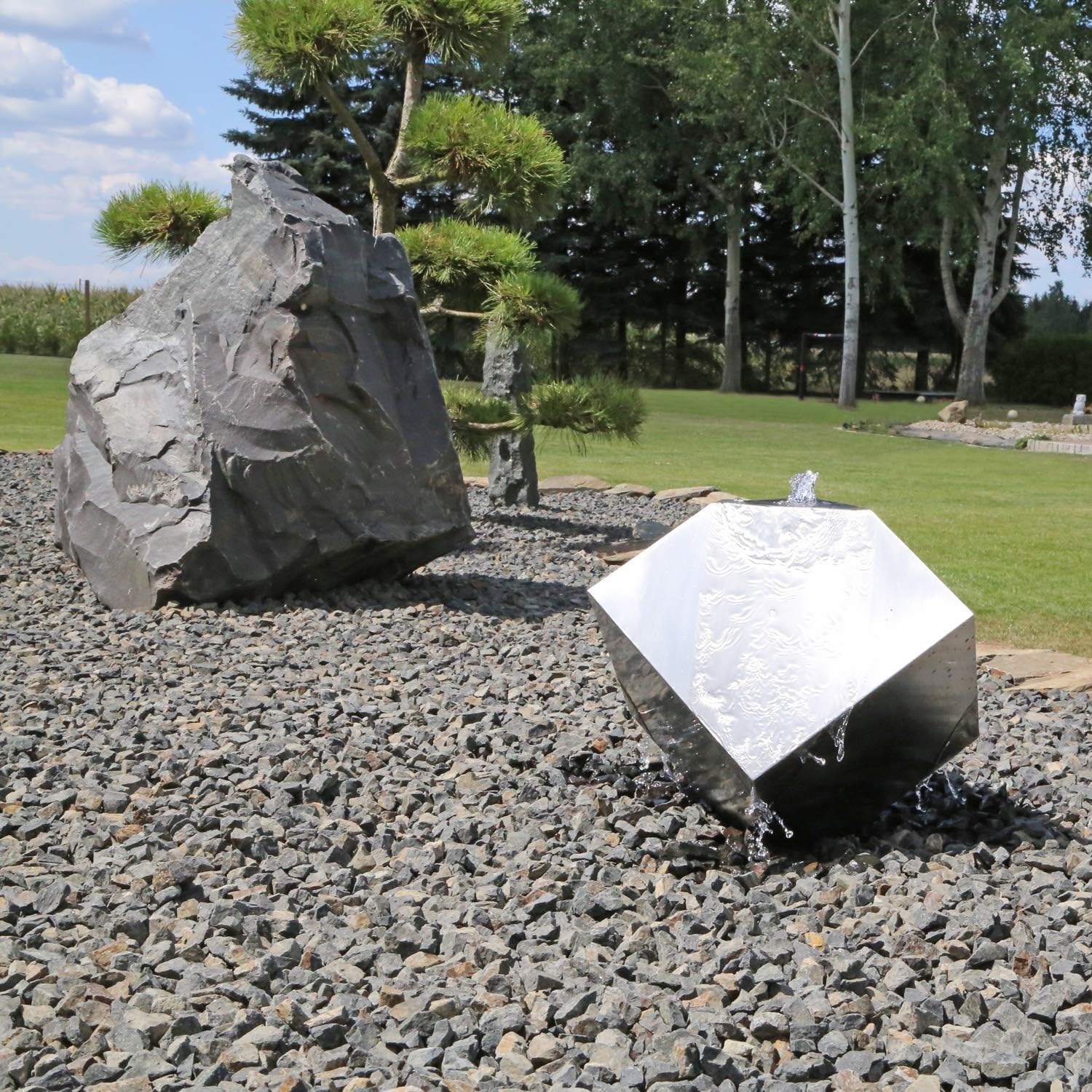 - Designer Edelstahl Springbrunnen mit auf der Spitze stehendem Würfel. Aufregende Formen aus hochwertigen Materialen und mit beruhigendem Wasserspiel.