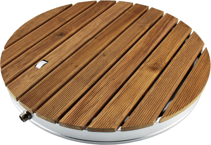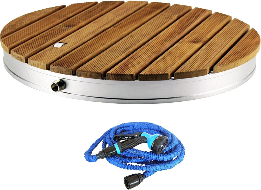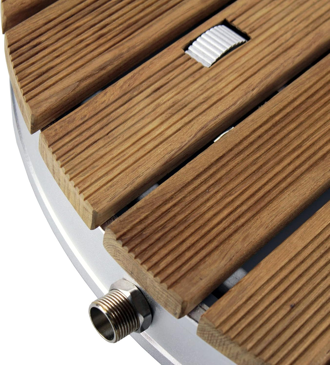 - INNOVATIV: Die Gartendusche mit runder Teakholzbodenplatte sorgt an heissen Sommertagen für eine erfrischende und wohltuende Abkühlung unter freiem Himmel und erfrischenden Wasserspass für Kinder, Erwachsene und Vierbeiner.