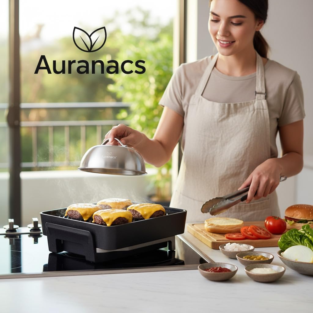 - Perfekte Schmelzergebnisse: Bündelt Hitze und Dampf unter der Haube – Käse wird cremig, Burger bleiben saftig und aromatisch.