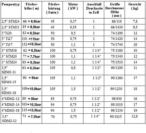- Hier bieten wir je nach Auswahl 2,5" , 3" , 3,5" und 4" Pumpen an. Es handelt sich um Pumpen mit schwimmend gelegerten Schaufelrädern daher sind sie sandresistent < 5% Die Kabellänge bei jeder Pumpe beträgt 20 m Deten der Pumpe können der Taballe entnommen werden.