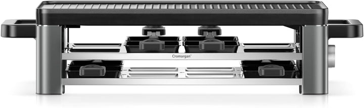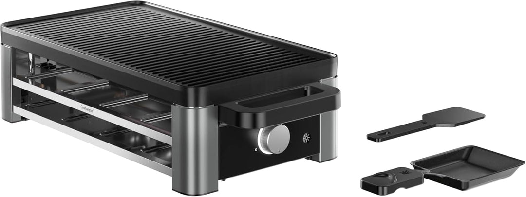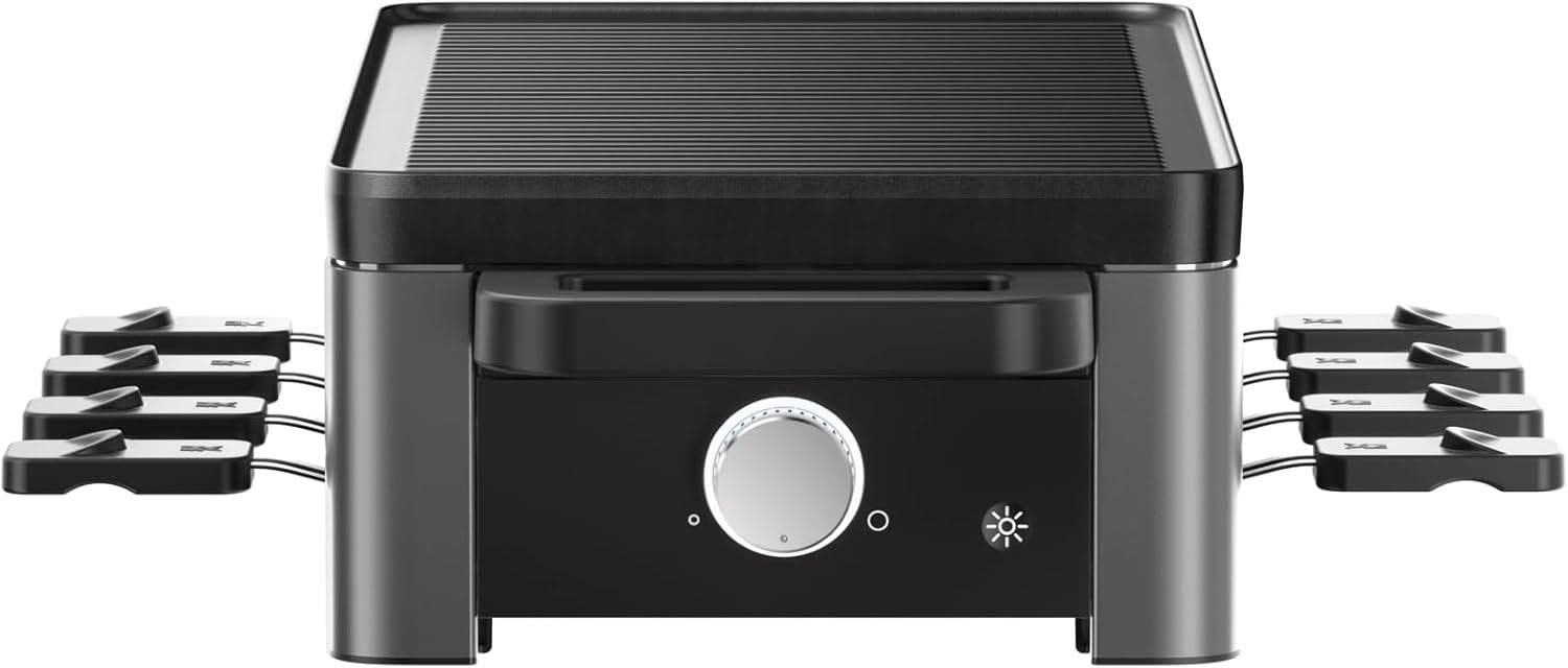 - Inhalt: 1x Raclettegerät mit Wende-Grillplatte (61,4 x 35,9 x 20,9 cm, 1500 W, Kabellänge 2m), 8x antihaftbeschichtete Raclette Pfännchen, 8x Raclette Schaber - Artikelnummer: 0415040011