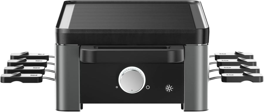 - Perfekte Raclette-Ergebnisse mit variabler Temperaturkontrolle, während LED-Leuchten den aktuellen Status anzeigen rot für Aufheizen, weiss für Bereitschaft