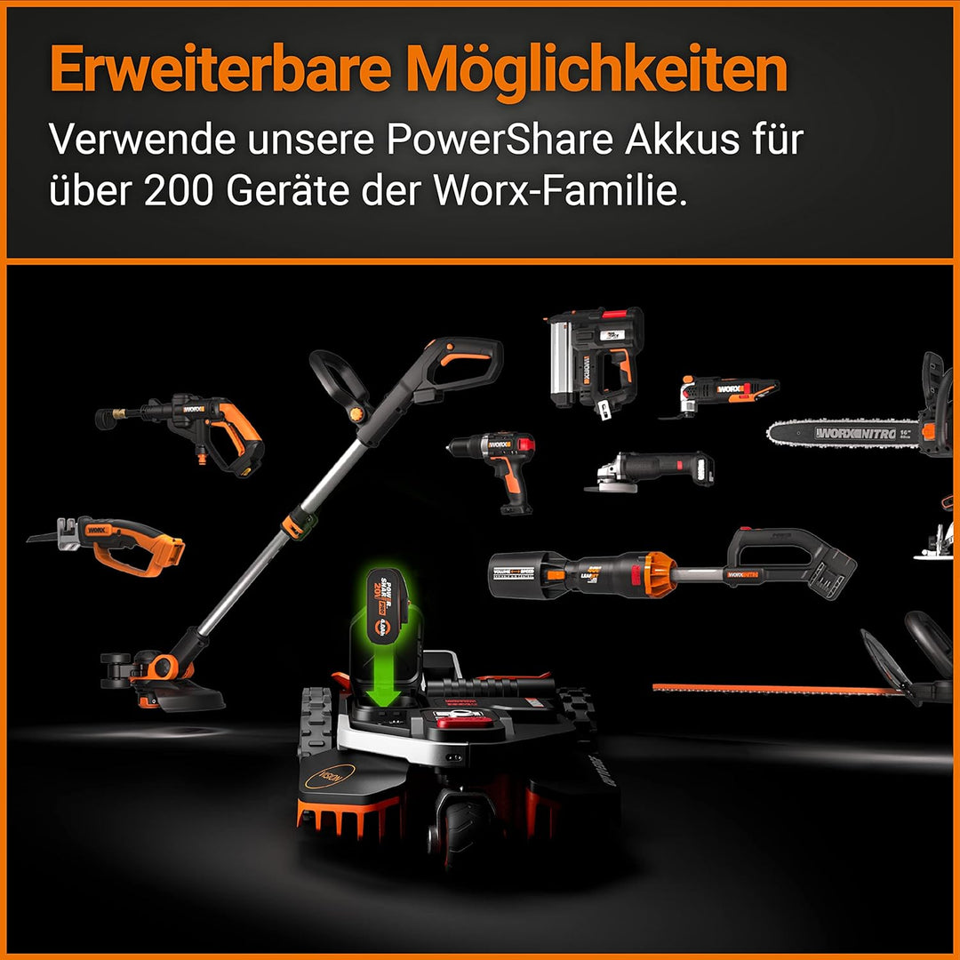- EIN AKKU, UNZÄHLIGE MÖGLICHKEITEN: Die Worx PowerShare-Batterie liefert nicht nur den Strom für die Mähroboter Landroid und Vision, sondern kann auch für alle batteriebetriebenen Gartengeräte und Elektrowerkzeuge von Worx PowerShare verwendet werden