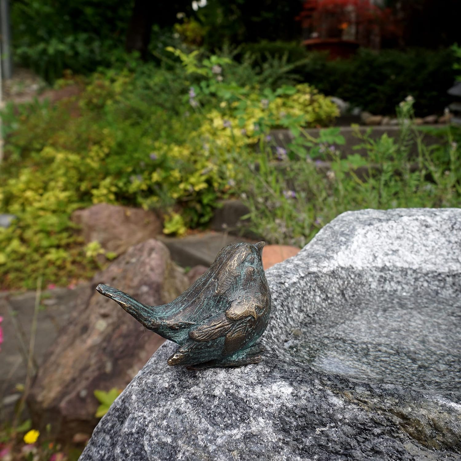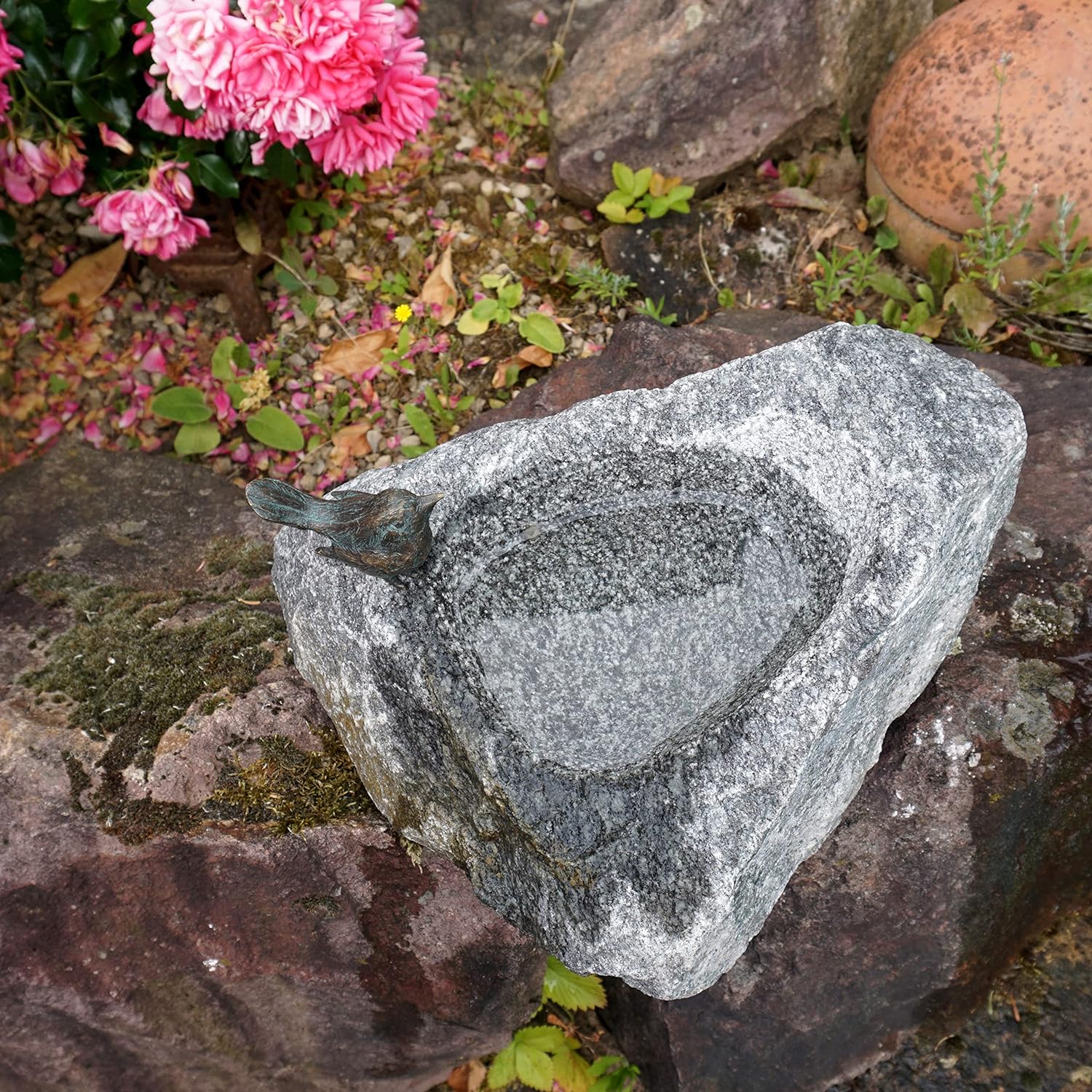 - 100% Handgefertigte Vogeltränke mit Bronze Vogel - auf Schwarzwald Granitstein grau - von Rottenecker
