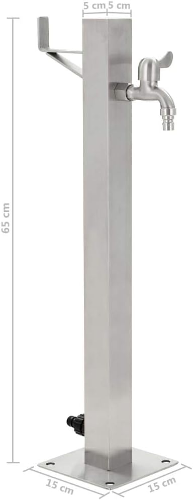 - Produkte eigenschaften: Farbe: Silbern Material: Edelstahl Abmessungen Säule: 5 x 5 x 65 cm (L x B x H) Bodengrösse:15 x 15 cm (L x B) Mit einer flachen oberen Schweissplatte Mit einer Halterung zum Aufhängen des Wasserschlauchs Anschluss unten: 1/2