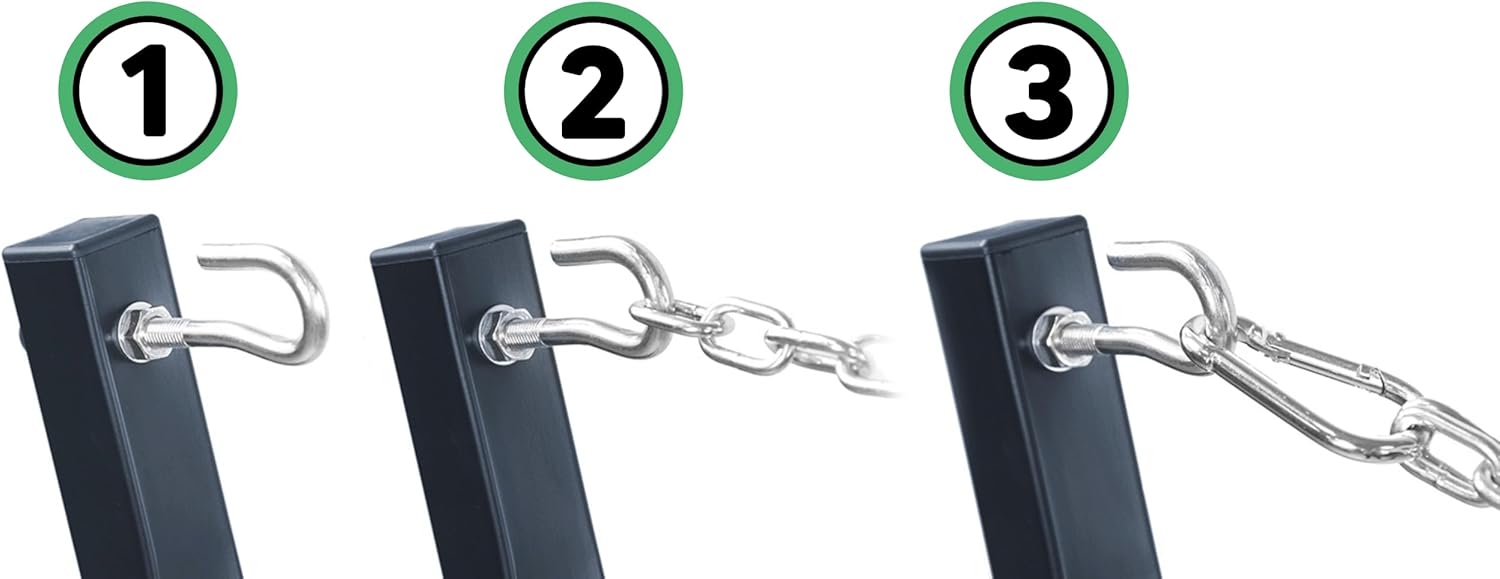 - ✅ Komplettes Set – schnell montiert & leicht zu verstauen - Im Lieferumfang enthalten sind alle Montagematerialien: Haken, Ketten, Karabiner, Schutzfüsse und Montageanleitung. Der Aufbau ist intuitiv und dauert nur wenige Minuten. Bei Nichtgebrauch