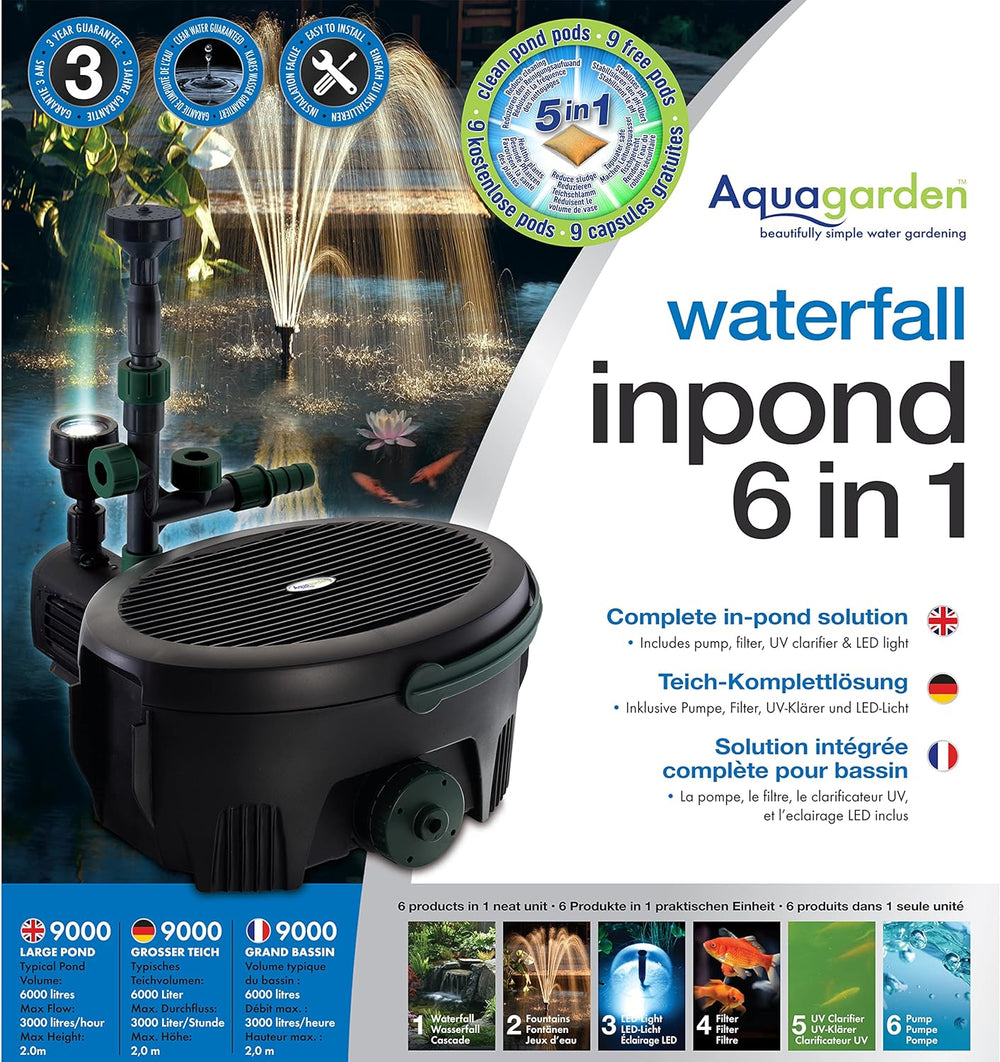 Aquagarden Inpond 9000, Teich- und Wasserpumpe, Filter, UV-Klärer, LED-Strahler und Springbrunnen, K