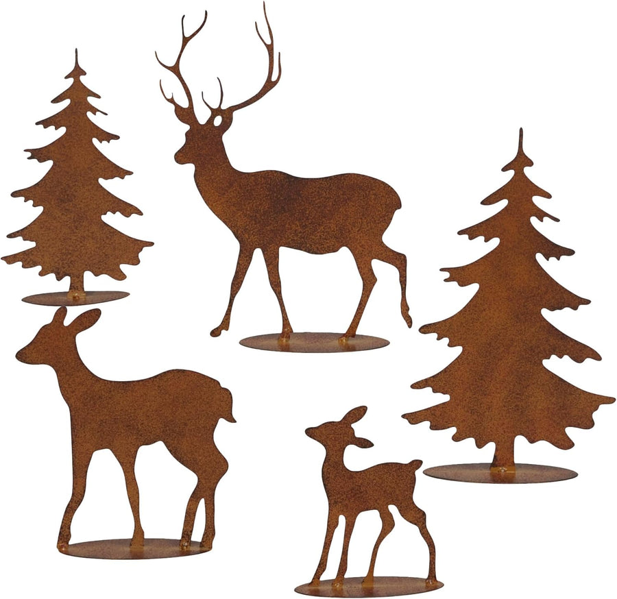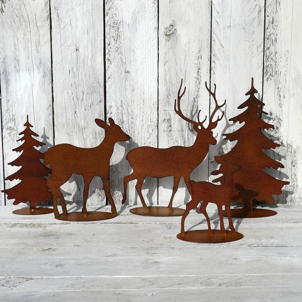 Storm's Gartenzaubereien Gartenstecker Deko Rehe und Hirsche mit 2 Tannen in Rostpotik zum Stellen-