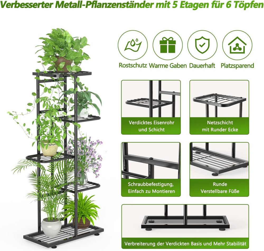 MAIJIAJU 5 Etagen Blumenständer Metall Schwarz mit Gartengeräte und Handschuhe, 95cm Ecke Blumenrega